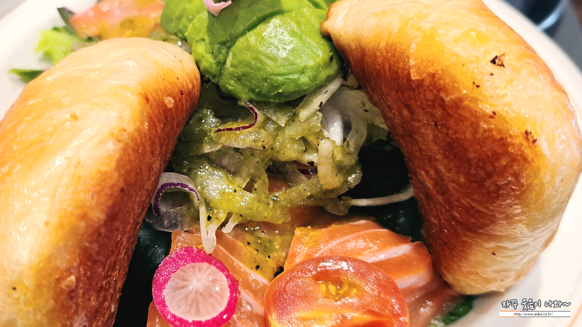 샐러드 위에 연어가 올려 있고요. 그 위에 양파 슬라이스 듬쁙, 그리고 그 위에 아보카도가 올려 있습니다.