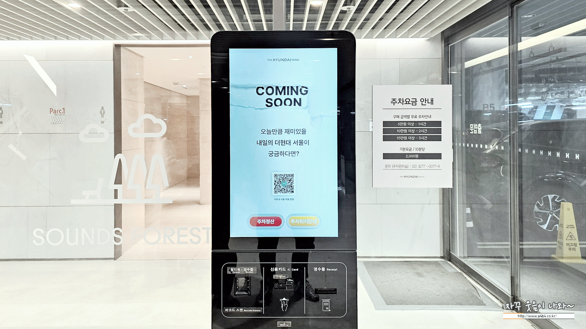 출차시 아래 주차장 무인정산기에서 정산하시면 되는데요. 스타벅스 더현대서울R점(B2)의 경우 주차정산 미지원 매장입니다.