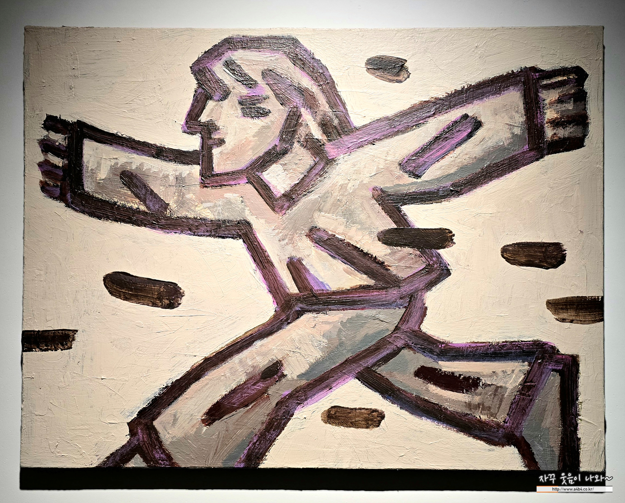 현대 ‘액체적 관계’ 속 과잉 연결의 피로에서 작가는 바닥에 엎드린 인물이나 팔 벌린 모습으로 관계 회복 의지와 희망을 그린다. 두터운 물감 층으로 무게를 더하며, 삶의 고쳐짐 가능성을 탐구한다.