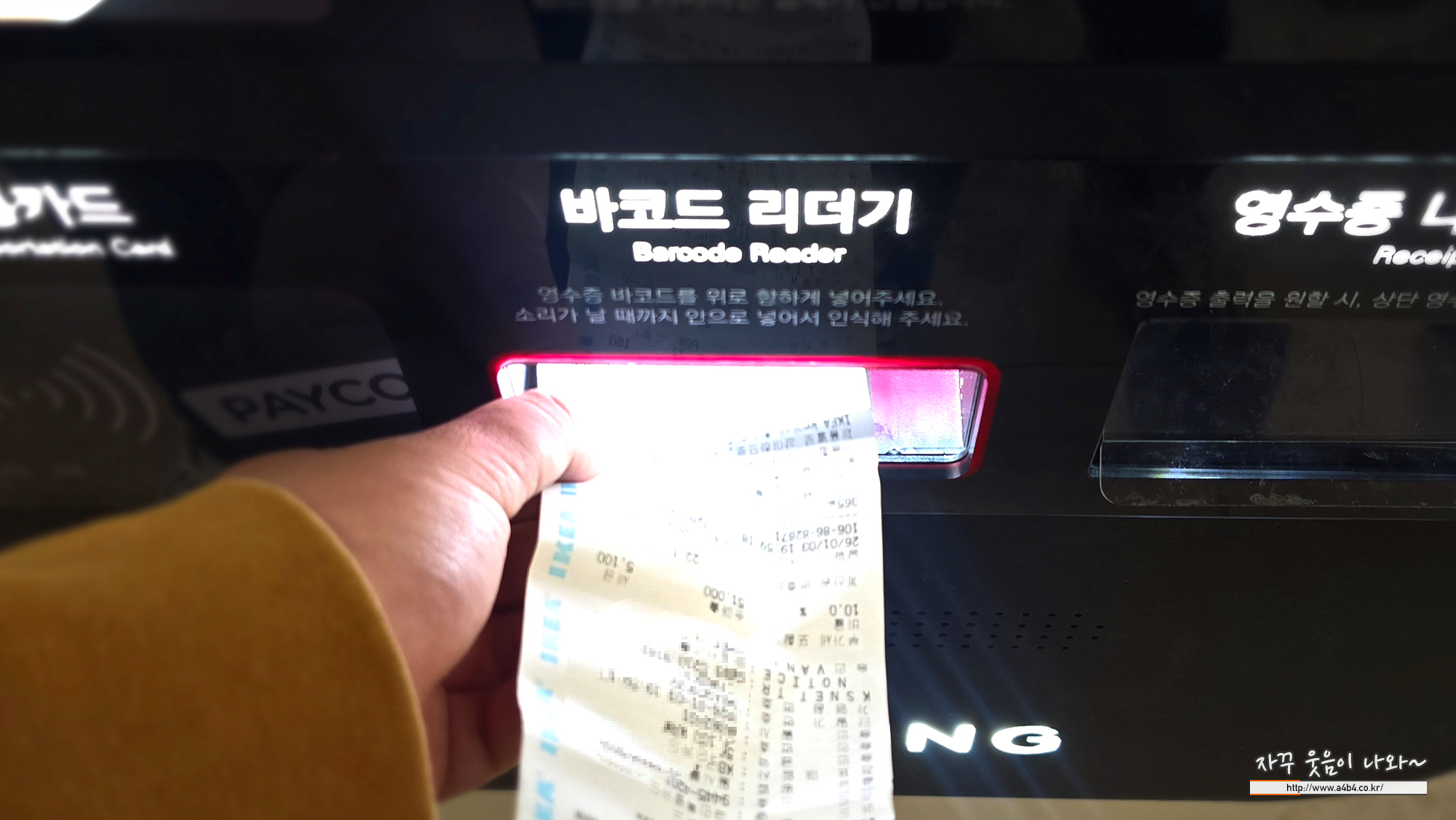 주차요금 정산기 하단에 영수증 바코드 인식하면 무료주차 정산됩니다.