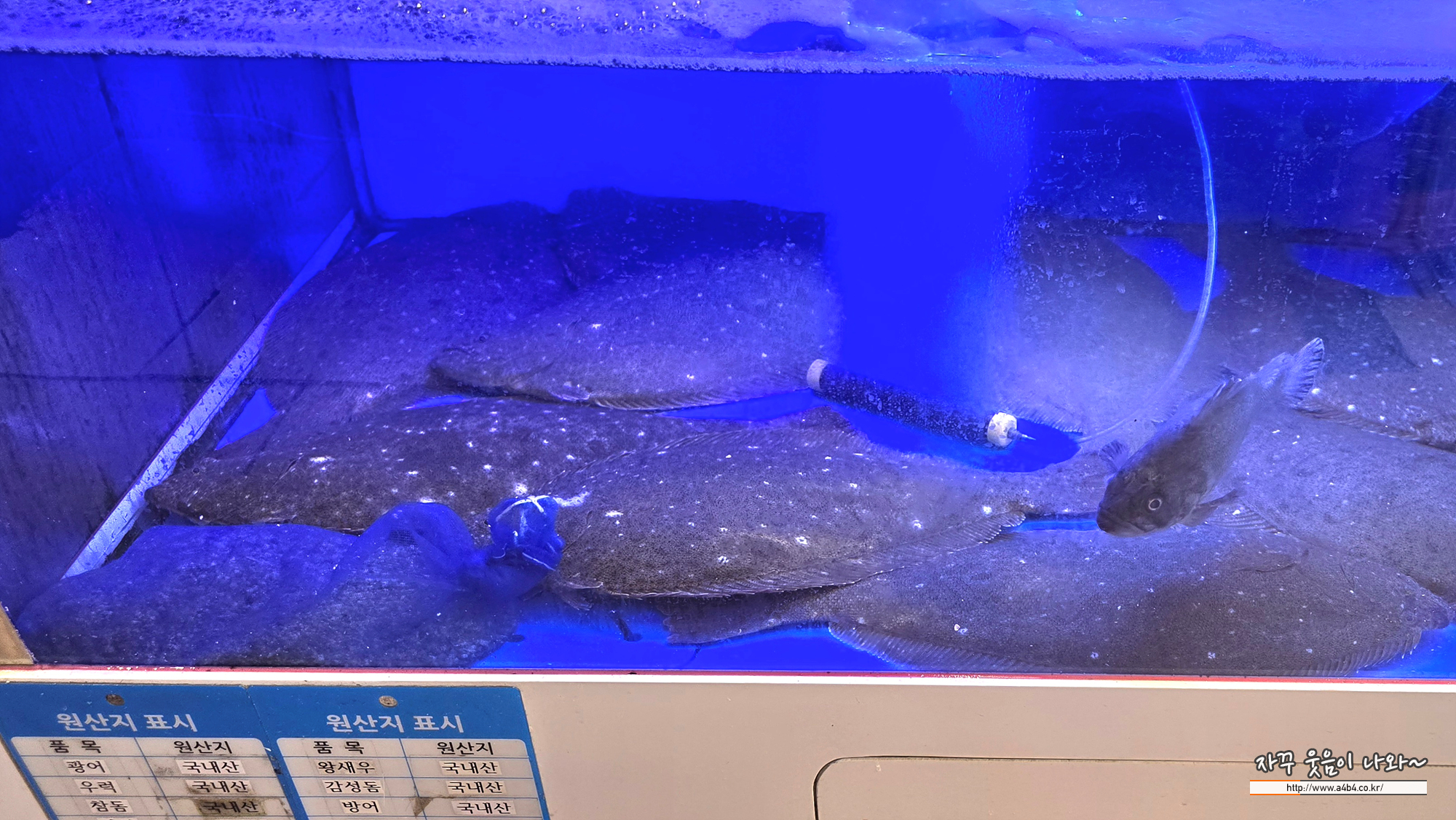매장안에 식사할 수 있는 공간은 없습니다. 회포차 오지다는 이곳 아닙니다. 이곳은 실내에 수족관과 계산대만 있는 방이시장 내 횟집입니다.