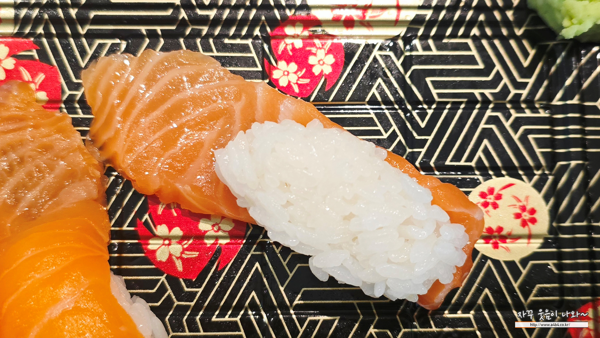 연어초밥 상태, 고급초밥집에 비할 수 없지만... 마트초밥에 비해서는 가성비 매우 좋습니다. 밥이 조금 많지만...