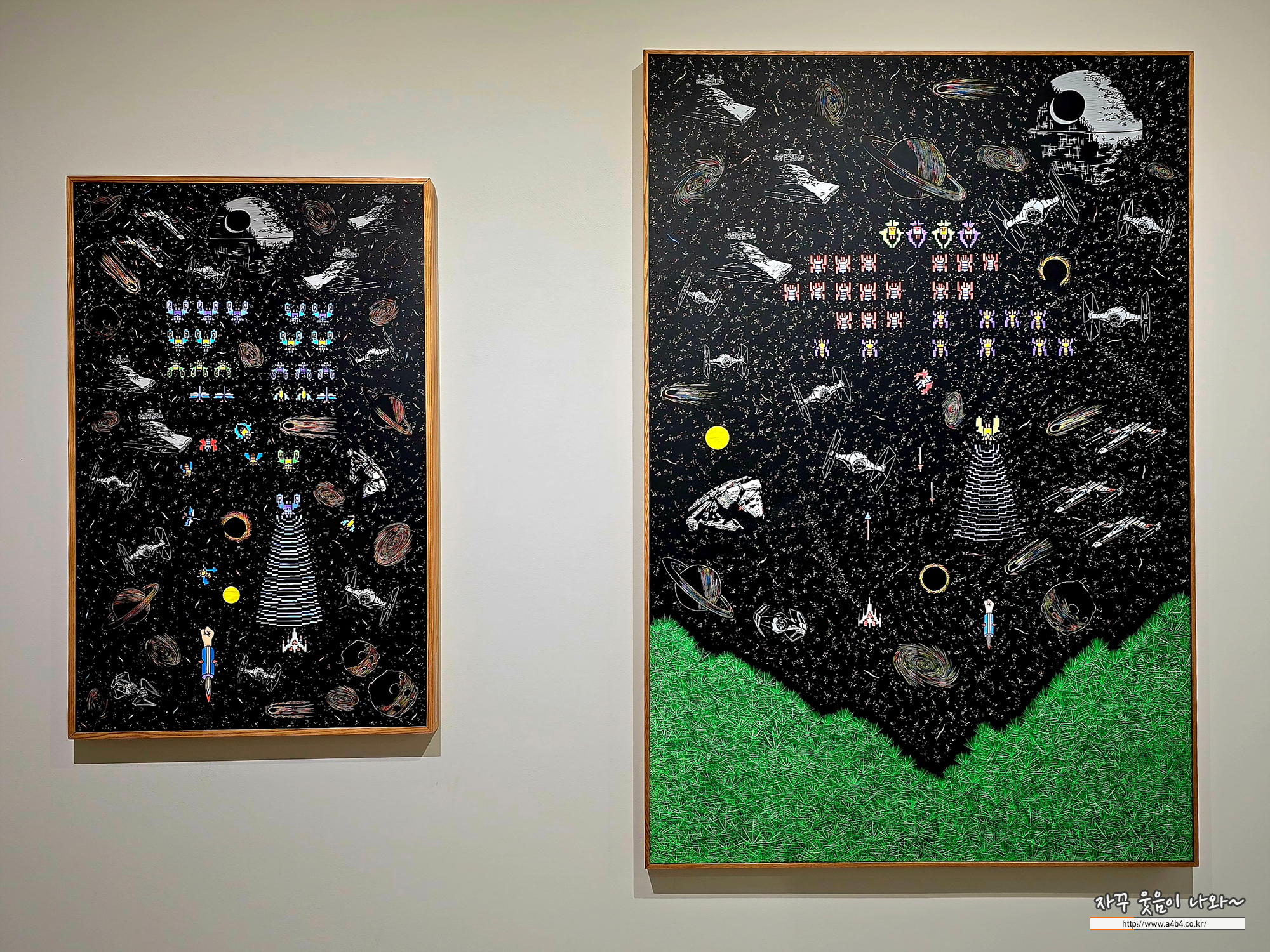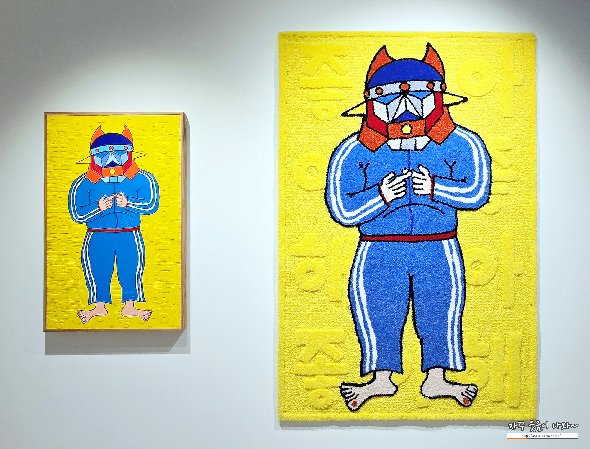 대중문화의 아이콘을 유머와 풍자로 비틀어 개인의 기억과 사회 현실을 동시에 환기해 온 작가다. 태권브이 같은 친숙한 캐릭터를 동시대의 삶 속으로 옮기며, 영웅 서사가 생활인의 무기력과 부조리, 소박한 염원으로 전이되는 순간을 포착한다. 판화적 감각에 기반한 화면 구성과 텍스트가 결합된 만화적 구조, 과감한 색채는 그의 작업을 이루는 중요한 요소다. 최근에는 ‘우주 너머’ 연작을 통해 밤하늘과 숲의 풍경 위에 유년의 이미지와 상상을 교차시키며, 기억과 상상의 서사를 회화로 확장하고 있다.