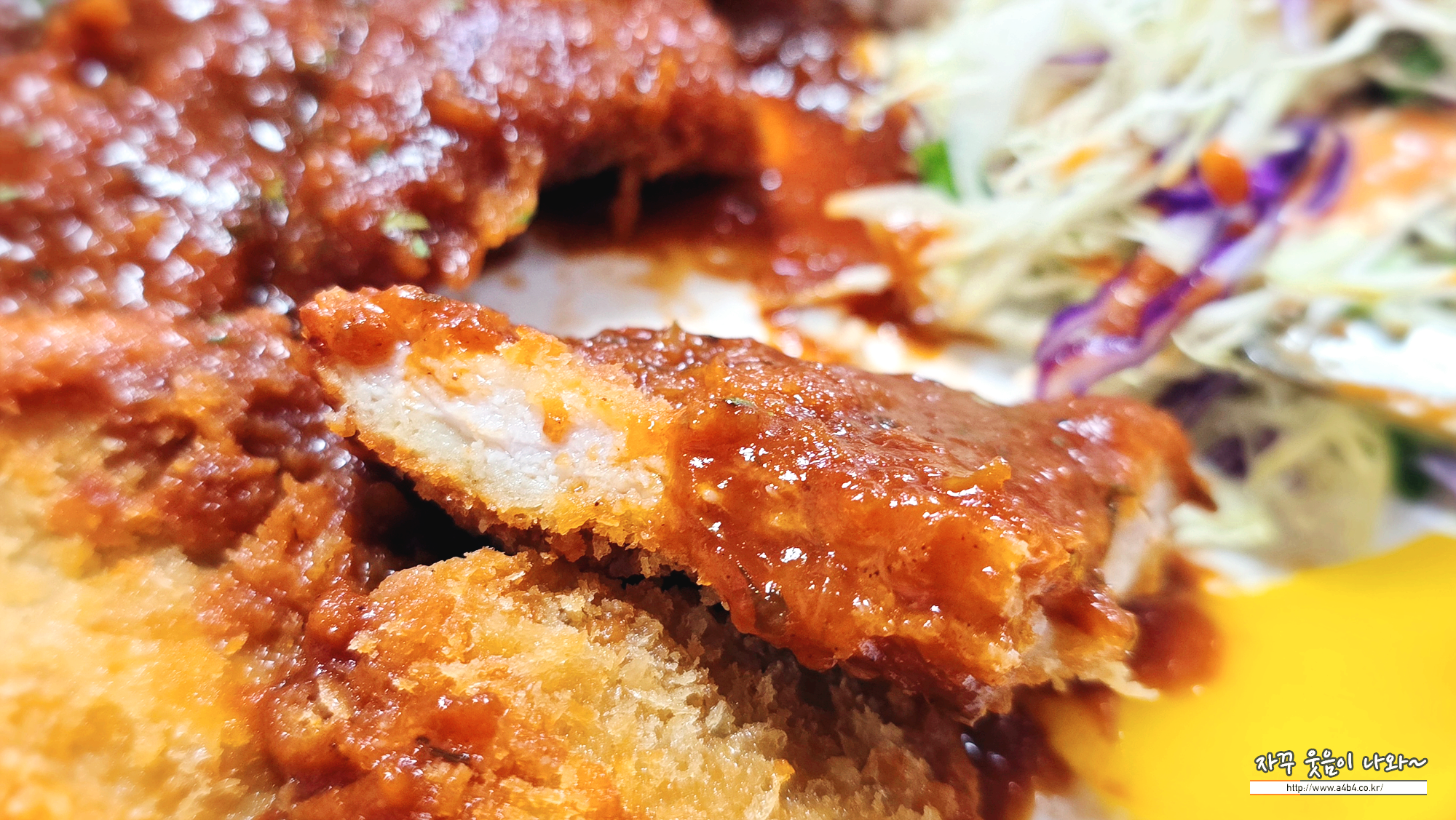 돈까스 소스는 과일 버섯 등 맘스돈까스 비법 소스가 듬뜩 올려 있습니다. 새콤달콤한 맛이 강한 돈까스 소스인데요. 상당히 매력적인 소스 맛을 보입니다. 약간 초딩스러운 옛날 돈까스 맛을 보이네요.