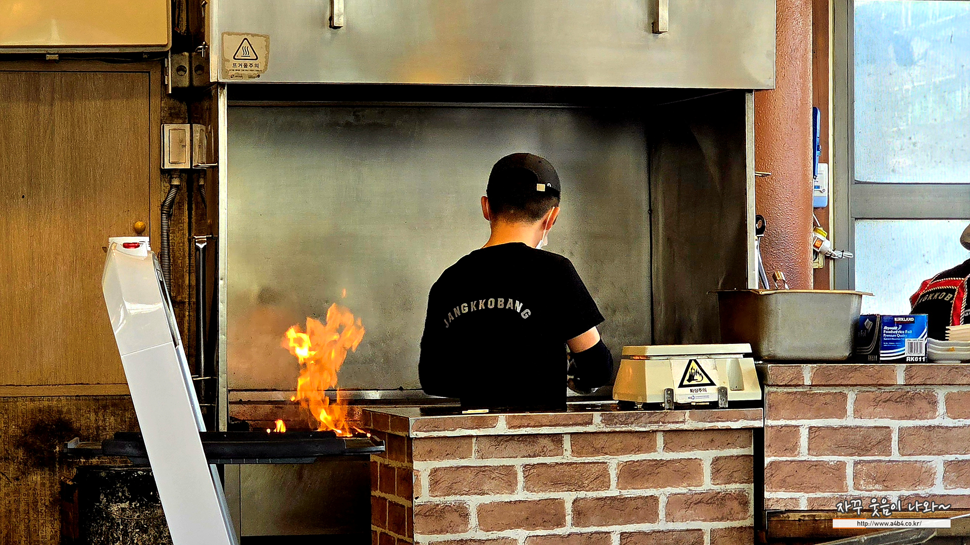 주문하면 매장 입구에서 직화로 돼지구이 만들어 주십니다. 달군 돌판위에 썬양파를 올리고 그 위에 돼지구이를 올려주시네요.