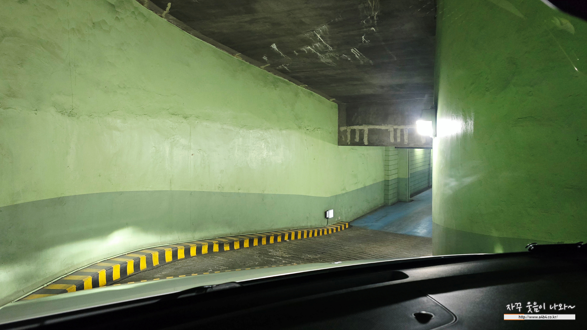 국제전자센터 주차장 진입로입니다. 단방향으로 도로폭이 좁지는 않습니다. 중형 SUV 기준 경고음 없이 내려갈 수 있습니다. 연석이나 벽 보시면 큰 상처 없네요.