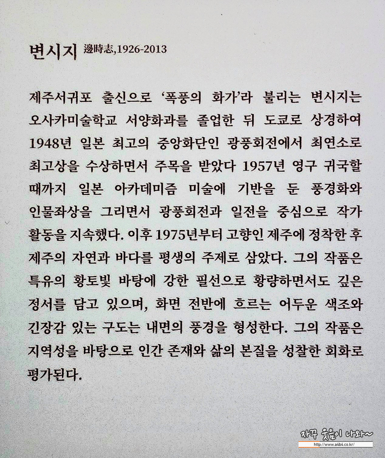 제주서귀포 출신 ‘폭풍의 화가’ 변시지는 오사카미술학교 서양화과를 졸업한 뒤 도쿄에서 1948년 광풍회전 최연소 최고상을 수상하며 주목받았습니다. 1957년 영구 귀국 전까지 일본 아카데미즘 기반의 풍경화와 인물좌상으로 활동했고, 1975년부터 제주에 정착해 제주의 자연과 바다를 평생 주제로 삼았습니다.