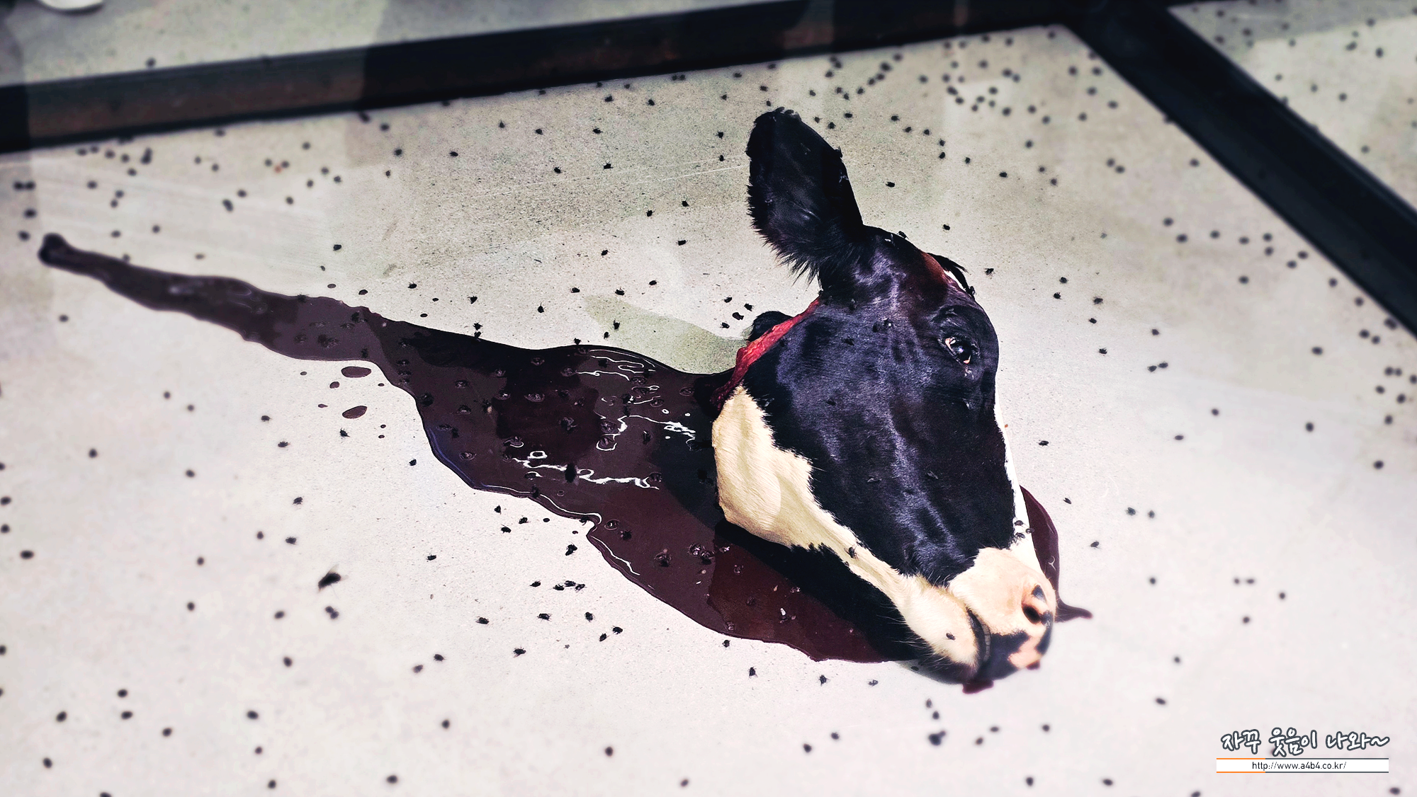 유리, 철, 실리콘 고무, 채색된 MDF, 전기 해충 퇴치기, 소 머리, 피,