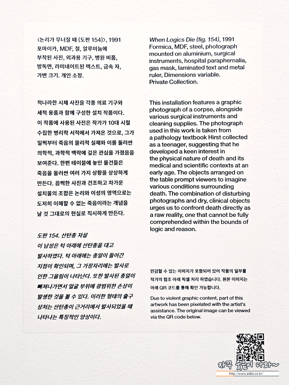적나라한 시체 사진과 의료 기구 및 세척 용품으로 구성된 설치 작품이다. 사진은 작가가 10대 시절 수집한 병리학 서적에서 가져온 것으로, 죽음의 물리적 실체와 의학적·과학적 맥락에 대한 그의 깊은 관심을 반영한다. 테이블 위 물건들은 죽음을 둘러싼 여러 상황을 상상하게 한다. 충격적인 사진과 건조한 설치물의 조합은 이성으로 이해하기 힘든 '죽음'이라는 개념을 날 것 그대로의 현실로 직시하게 만든다.