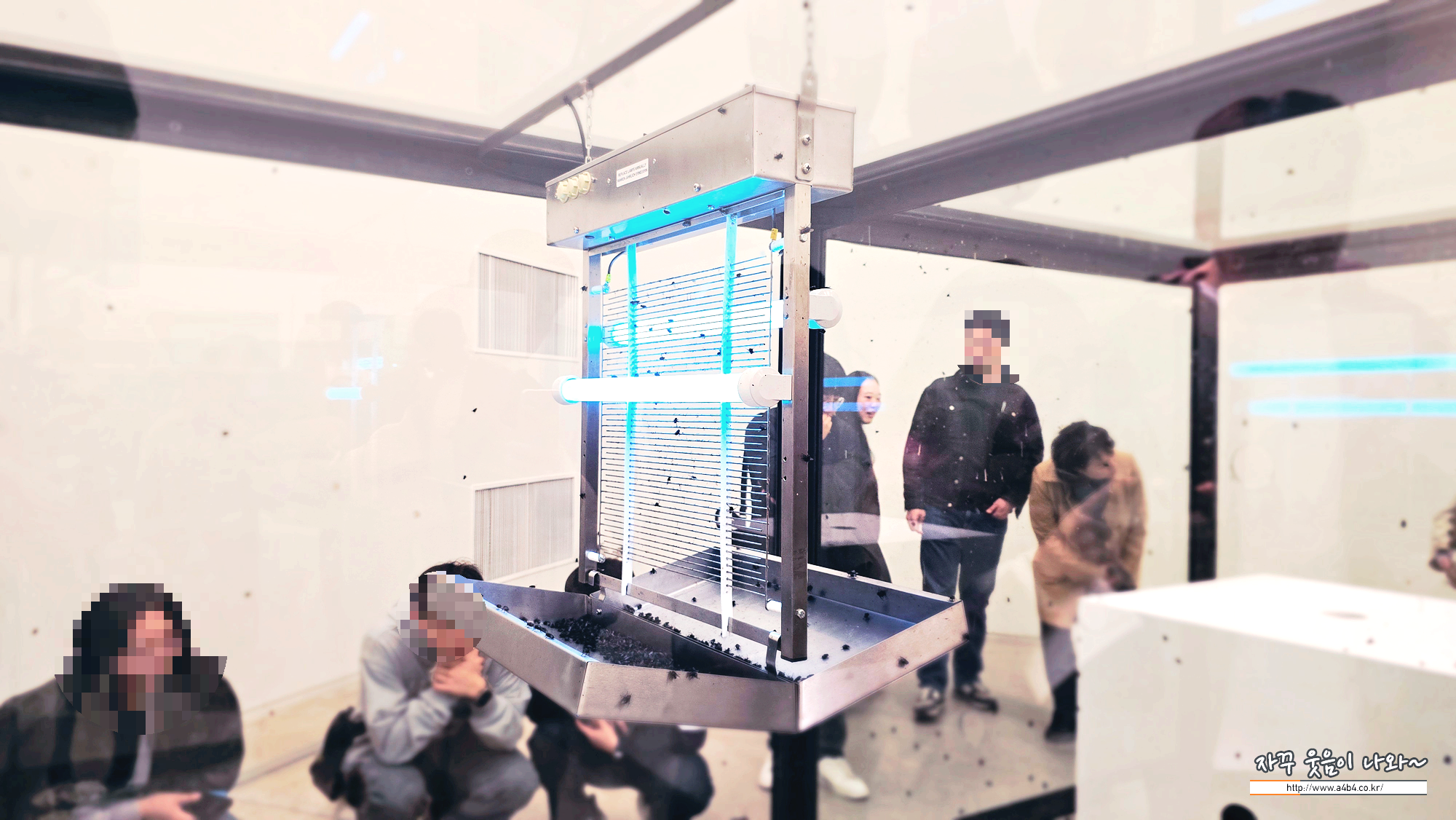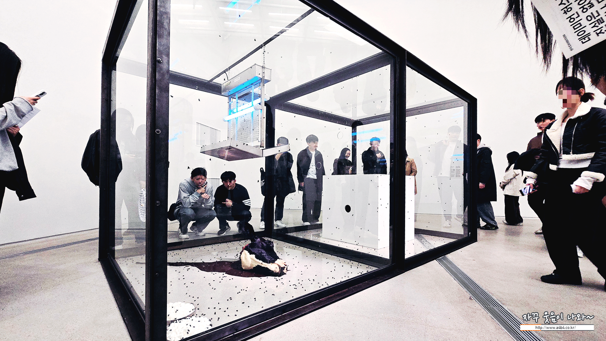 잘린 소머리와 파리 유충, 살충기로 구성된 이 설치 작품은 삶과 죽음의 순환을 시각화한다. 유리장 한쪽에서 부화한 파리들이 소머리를 찾아 이동하다 살충기에 의해 죽음을 맞이하도록 설계되었다. 생존을 향한 본능과 허망한 죽음이 실시간으로 반복되는 모습은 자연의 섭리가 얼마나 냉정하고 잔혹한지 여실히 보여준다.