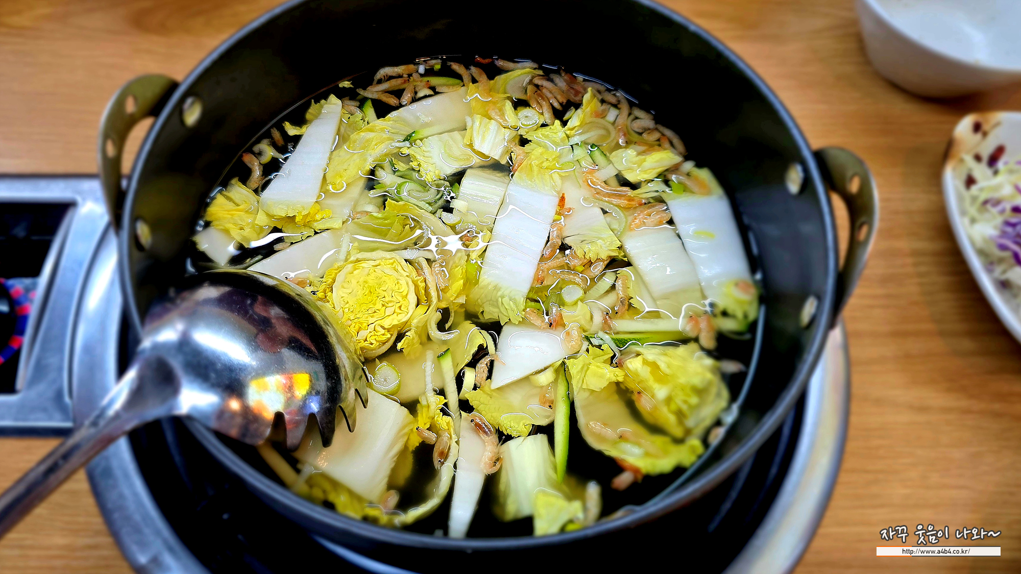 배추와 건새우가 들어간 시원한 칼국수 육수 나옵니다. 쌈밥과 함께 육수 드시는 것 추천 드리고요. 육수도 셀프코너에서 무한리필 가능합니다.