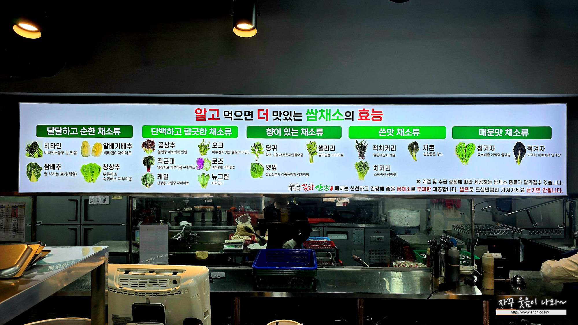 이배재 직화쌈밥 가락직영점에서 만나볼 수 있는 쌈채소 종류입니다. 제가 좋아하는 쌈배추와 케일, 씀쓸한 맛의 킥커리와 치콘도 있어서 좋았네요. 정말로 다양한 쌈채소를 만나볼 수 있는 부분이 이배제 직화쌈밥 추천하는 이유