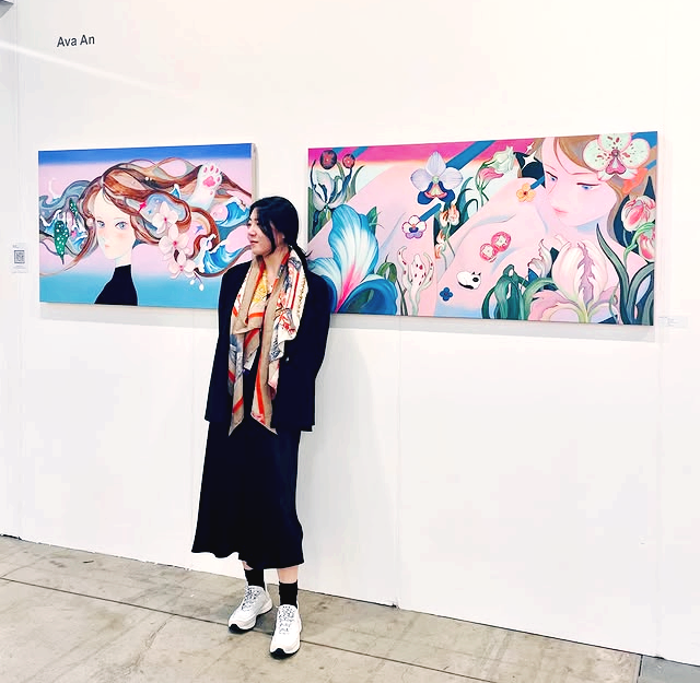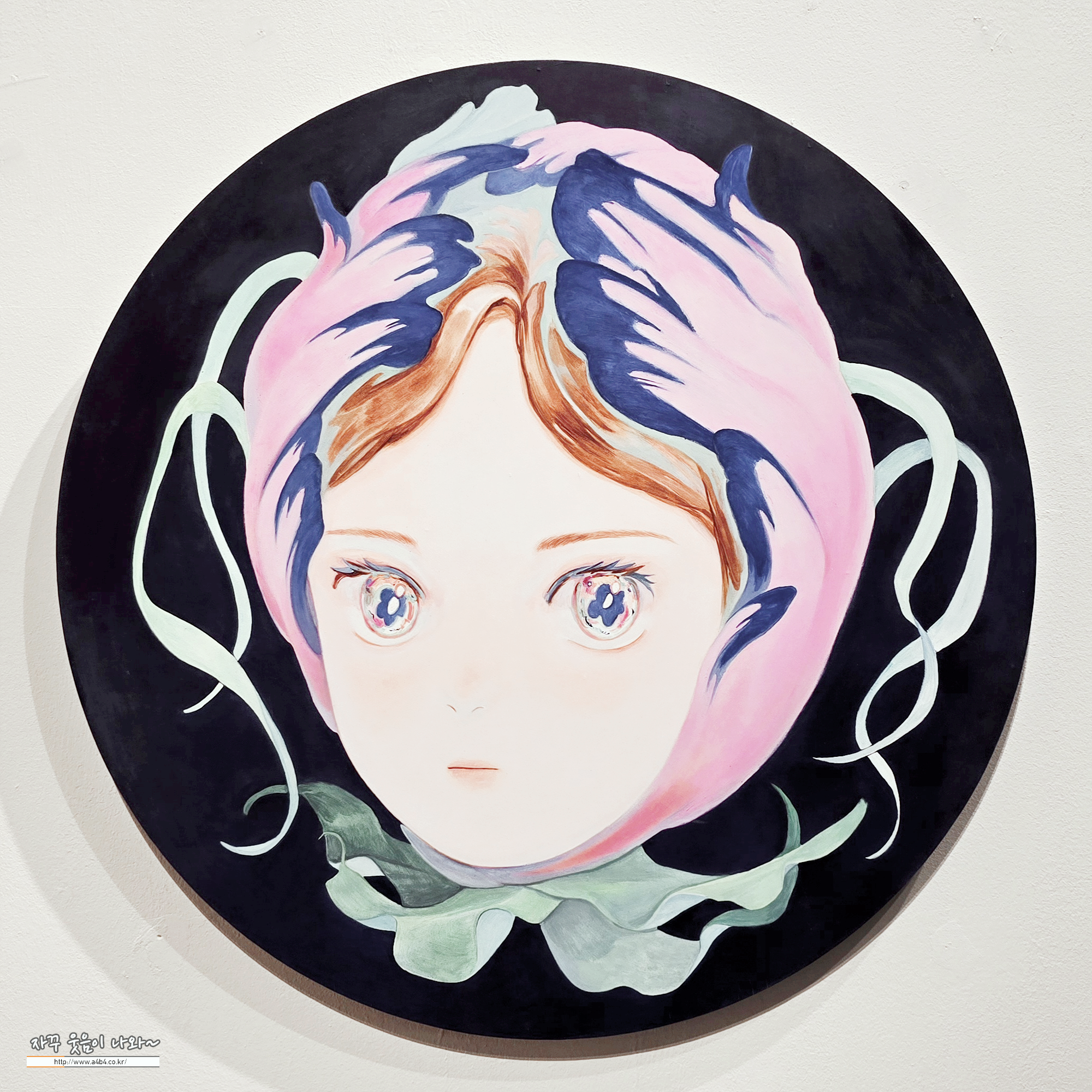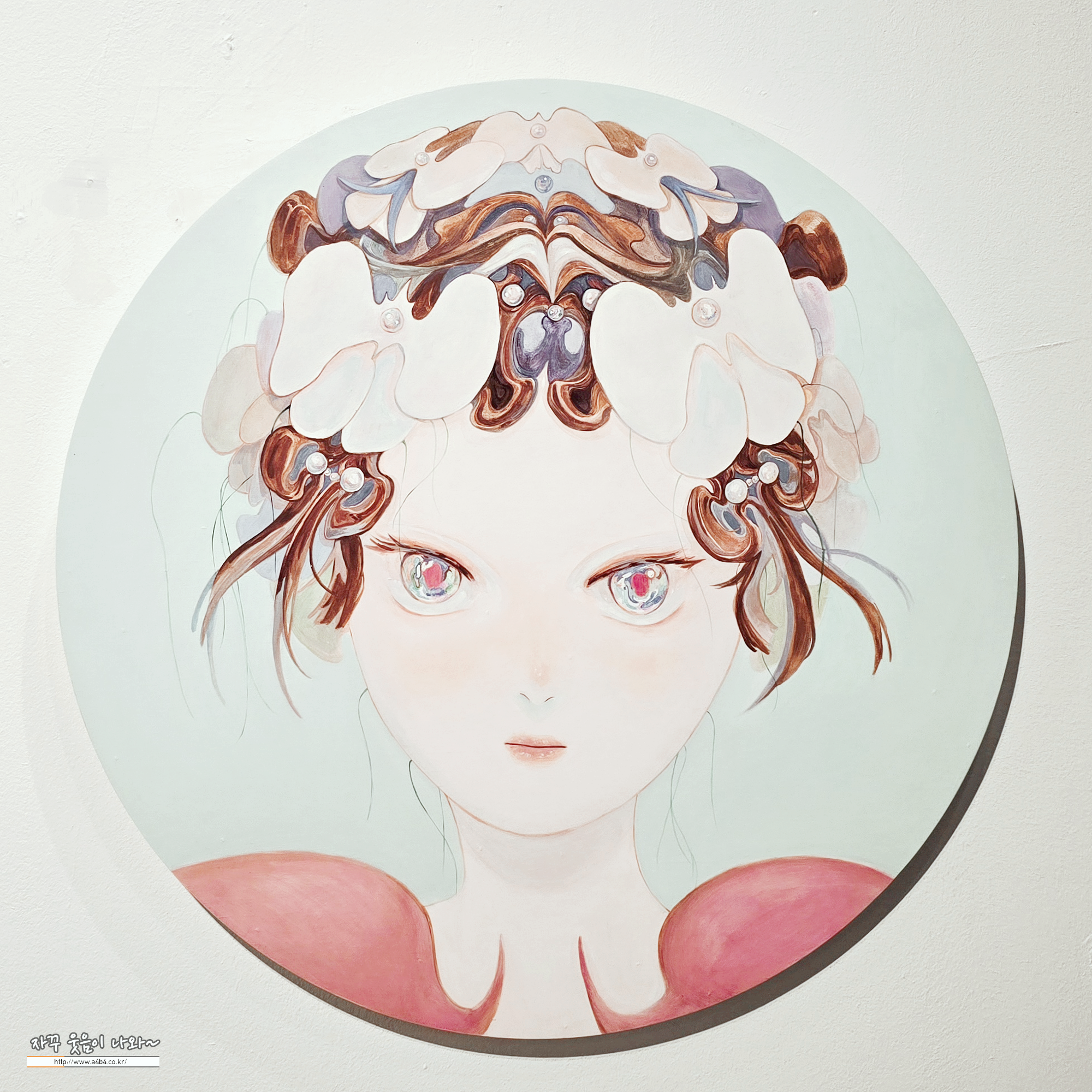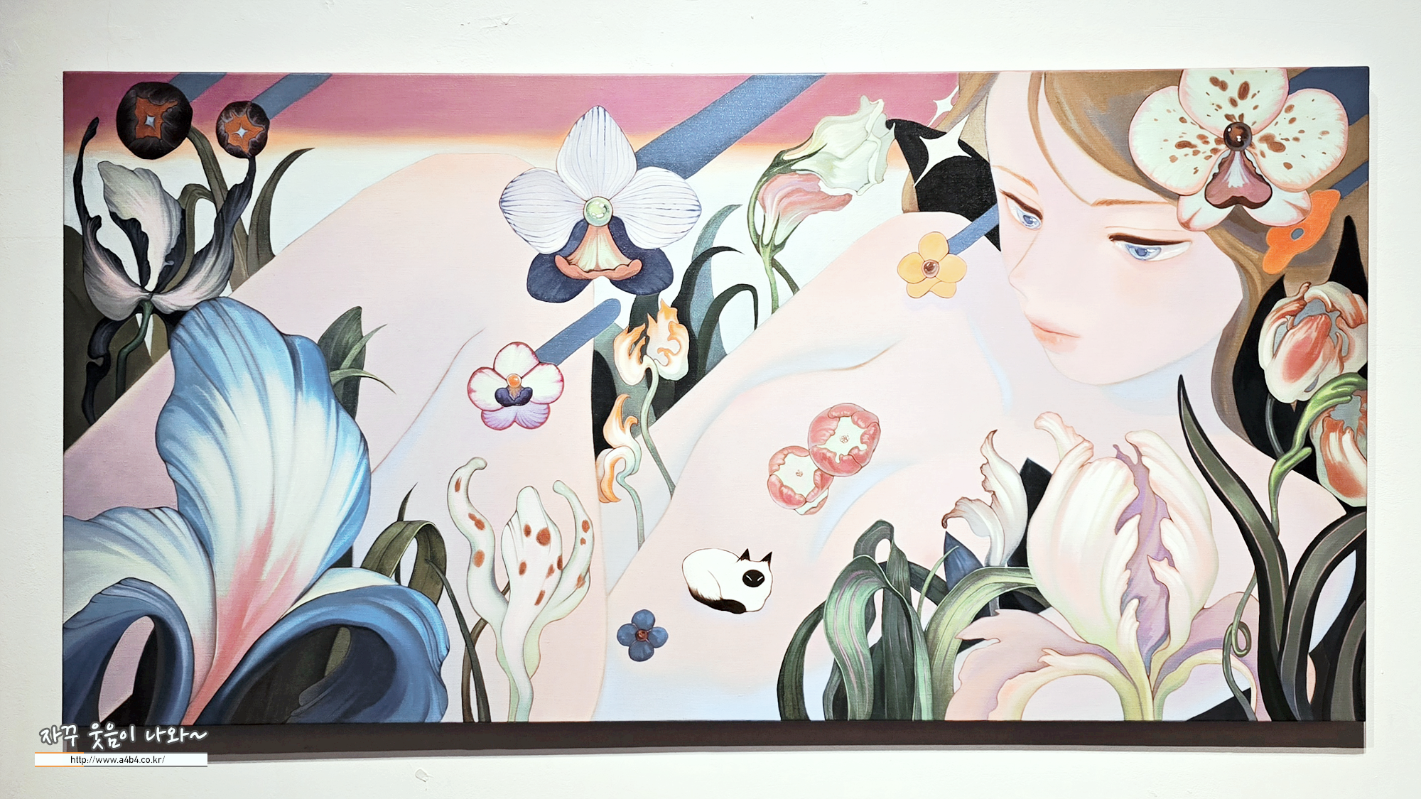 아바 작가는 인간 존재와 그를 둘러싼 세계를 상징적인 이미지로 풀어내는 작업을 이어오고 있습니다. 작가에게 인간에 대한 탐구는 자신의 경험에서 출발하며, 작품 속 여성 인물은 자아 인식에서 비롯된 인간의 기본적인 형상으로 등장합니다. 화면에 나타나는 별의 부스러기, 꽃, 비인간적 상징들은 인간의 보이지 않는 내면과 존재의 본질을 은유적으로 드러내는 장치로 사용됩니다.