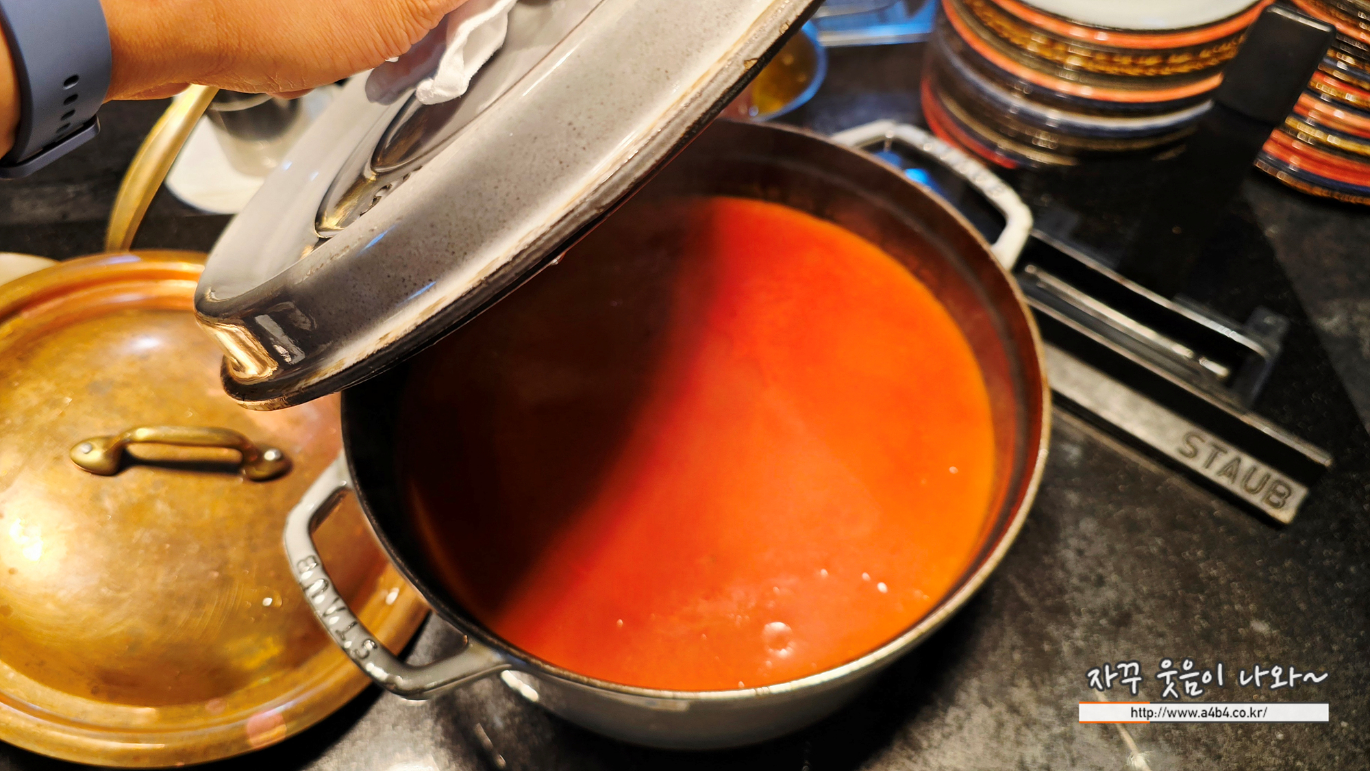 스프는 토마토 스프가 커다란 르크루제 냄비에 있는데요. 뚜껑 무게가 어마어마 합니다.