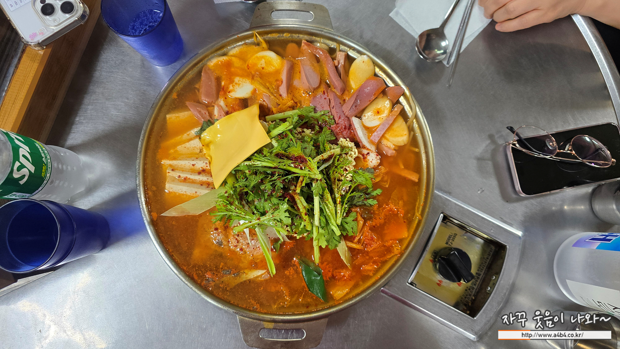 강동구청역 맛집 통큰양푼이찌개 본점 부대찌개 사리는 두부사리와 라면사리,치즈가 기본으로 나오네요.