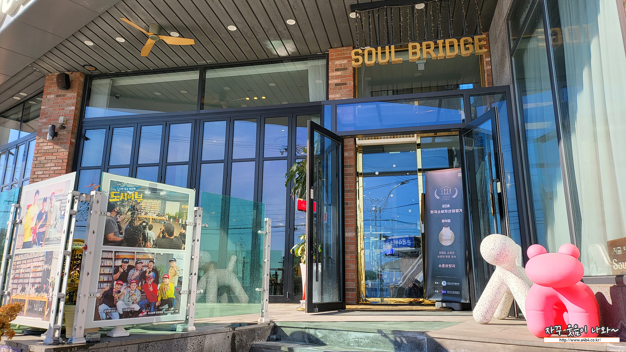 고성 소울브릿지 카페 입구에는 도시어부 출연진이 방문한 인증사진과 강원도 강아지동반 카페를 알리는 강아지 조형물이 설치되어 있습니다. 카페 1층에는 1층 테라스도 준비되어 있는데요. 겨울에는 날씨가 추워서 이용하기에는 어려움이 있네요.
