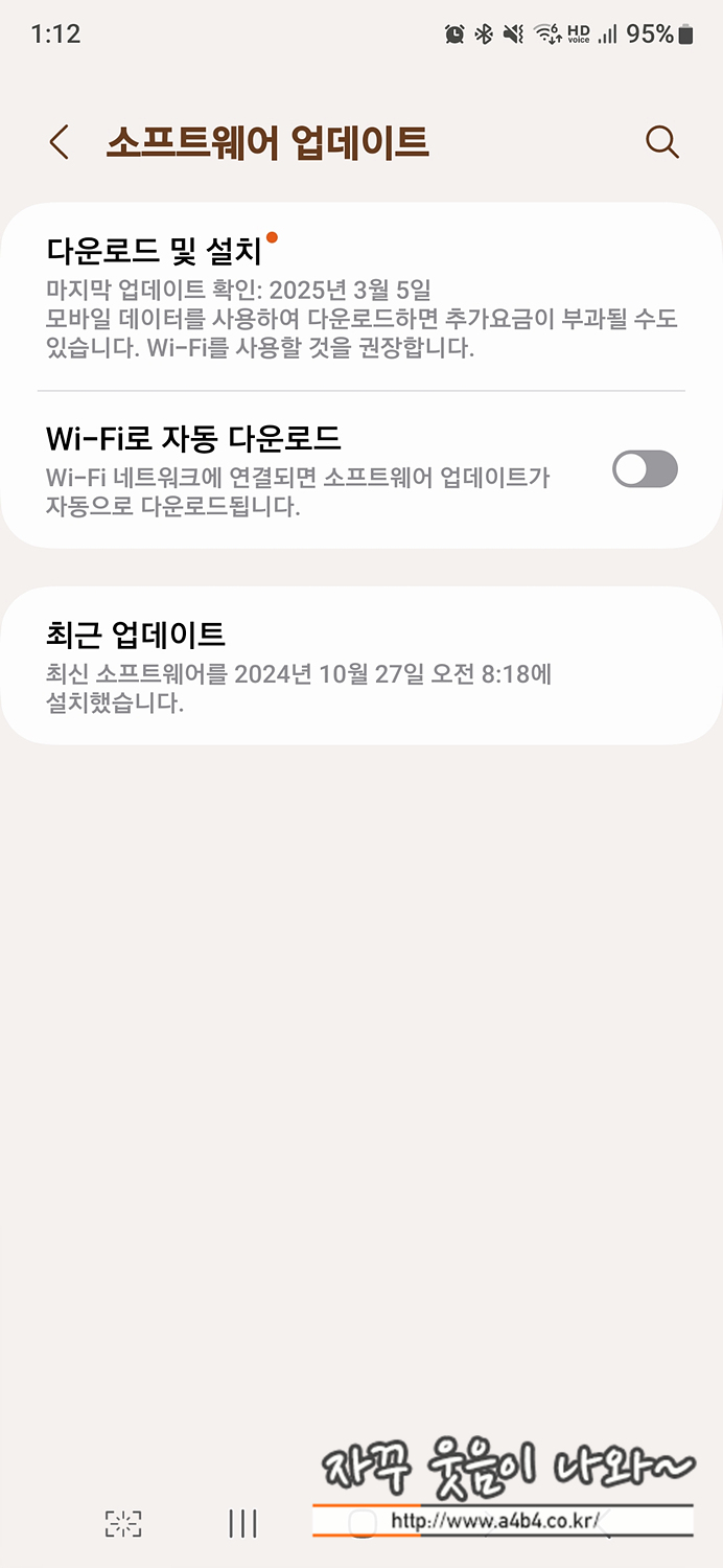 저는 기존에 one UI 6.0을 사용하고 있었고요. 계속 6.1로 업데이트 알림이 출력되었지만 업데이트 하면 ADB 사용한 카메라 무음 설정을 다시하고 굿락 다시 설정하는 등의 불편이 있어 매번 미뤘는데요. 원 UI 7.0 유혹을 뿌리치지 못하고 업데이트 진행합니다. 다만 한 번에 업데이트 되지 않고 총 두 번의 업데이트와 재부팅 과정이 진행되었습니다.