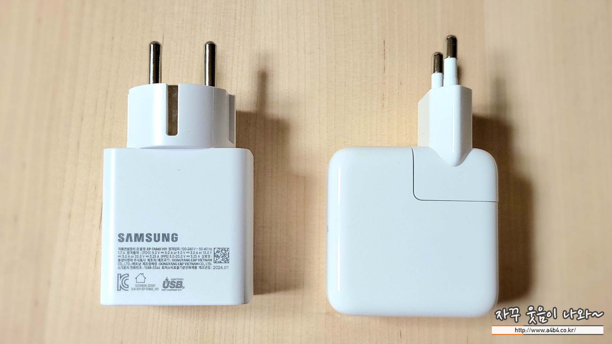 아래 사진 오른쪽 맥북에어 아답터는 작년에 구입한 맥북에어 M2 13.6인치 포함되어 있는 제품입니다. 2개의 C타입 포트를 지원하고 있어 케이블만 추가로 가지고 다니면 노트북 충전과 휴대폰 충전을 동시에 할 수 있는데요. 삼성 갤럭시북4 프로 360 아답터는 오직 구멍 하나...  워크샵이나 외부 회의, 세미나장 등에서 콘센트 구멍 하나의 소중함을 모르는 듯.