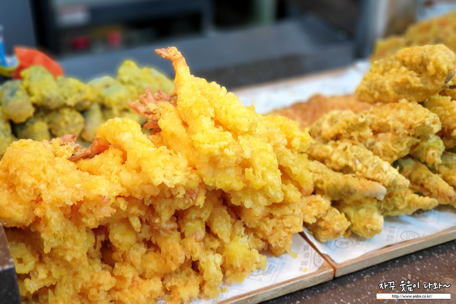 왕새우튀김, 고구마튀김, 야채튀김, 김말이, 고추튀김 등 여러 튀김들도 준비되어 있습니다.