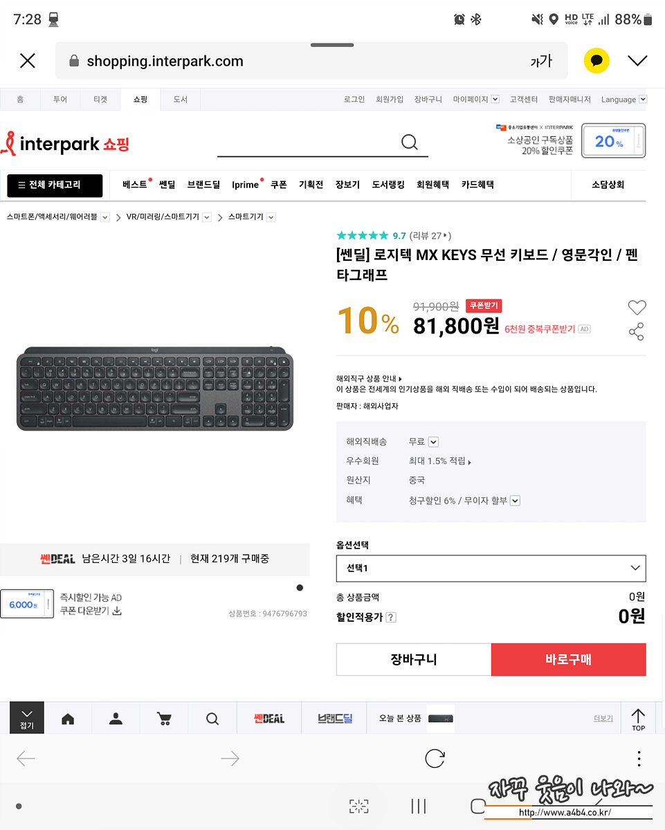 오늘 소개하는 로지텍 MX Key 무선 키보드의 경우 로지텍 코리아 정품의 경우 15만원을 넘는 가격을 보여주는데요. 저는 한글 각인이 없는 중국 직수입품을 인터파크쇼핑 쎈딜을 통해 MX KEYS 제품을 81,800원에 구입 했습니다. (배송비 포함) 정품 가격의 절반가격이네요.