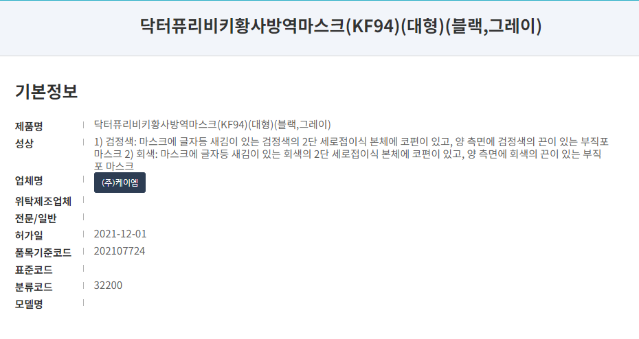 식품의약품안전처 등록 제품명칭은 '닥터퓨리뉴에스황사마스크 (KF94)'입니다. 제조원은 주식회사 케이엠으로 21년 2월 허가된 제품입니다. 닥터퓨리 브랜드의 경우 코로나19 초기부터 네이버스마트스토어를 통해 저렴한 가격에 매일 게릴라 판매를 하면서 저에게는 고마운 브랜드이기도 합니다.