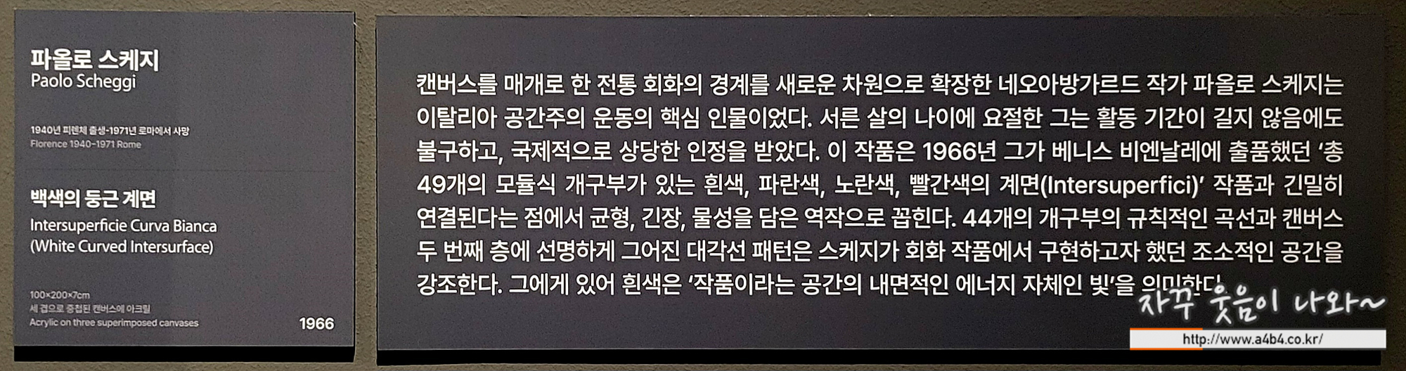 파올로 스케지는 캔버스를 매개로 한 전통 회화의 경계를 새로운 차원으로 확장한 작가로 평가받고 있습니다. 스케지는 서 른 살이라는 젊은 나이에 세상을 떠나고 말았는데, 작품 활동 기간이 길지 않았음에도, 1966년에 베니스 비엔날레에 초청되 는 등 국제적으로 상당한 인정을 받았습니다.