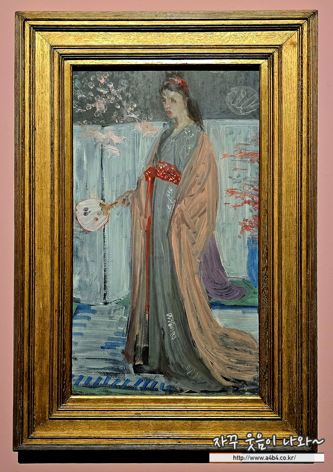 휘슬러의 이 작은 패널은 일본의 미술과 장식 예술에 대한 그의 관심을 보여줍니다. 휘슬러는 일본 판화의 아이디어를 그림에 통합한 최초의 서양 예술가 중 한 명이었습니다. 휘슬러의 포즈 선택은 18세기 화가이자 판화가인 기타가와 우타마로의 그린 하우스의 12시간이라는 시리즈에 나오는 여성들의 모습에서 영향을 받았을 가능성이 큽니다.