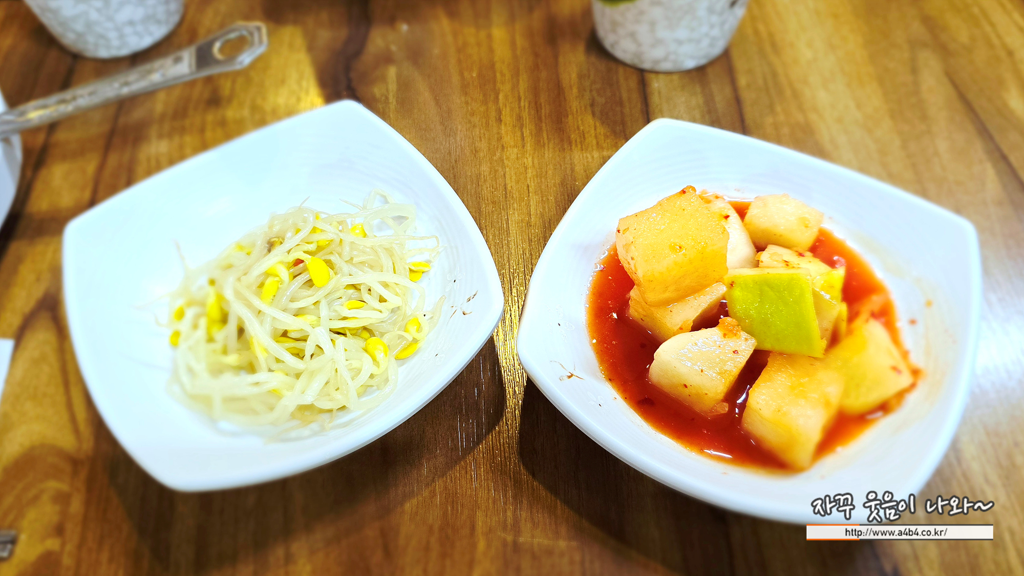돈푸짐 감자탕 반찬은 콩나물무침과 무채나물, 깍뚜기, 풋고추, 양파가 나오고요. 부족하시면 주방 앞 셀프코너에서 추가하시면 됩니다.