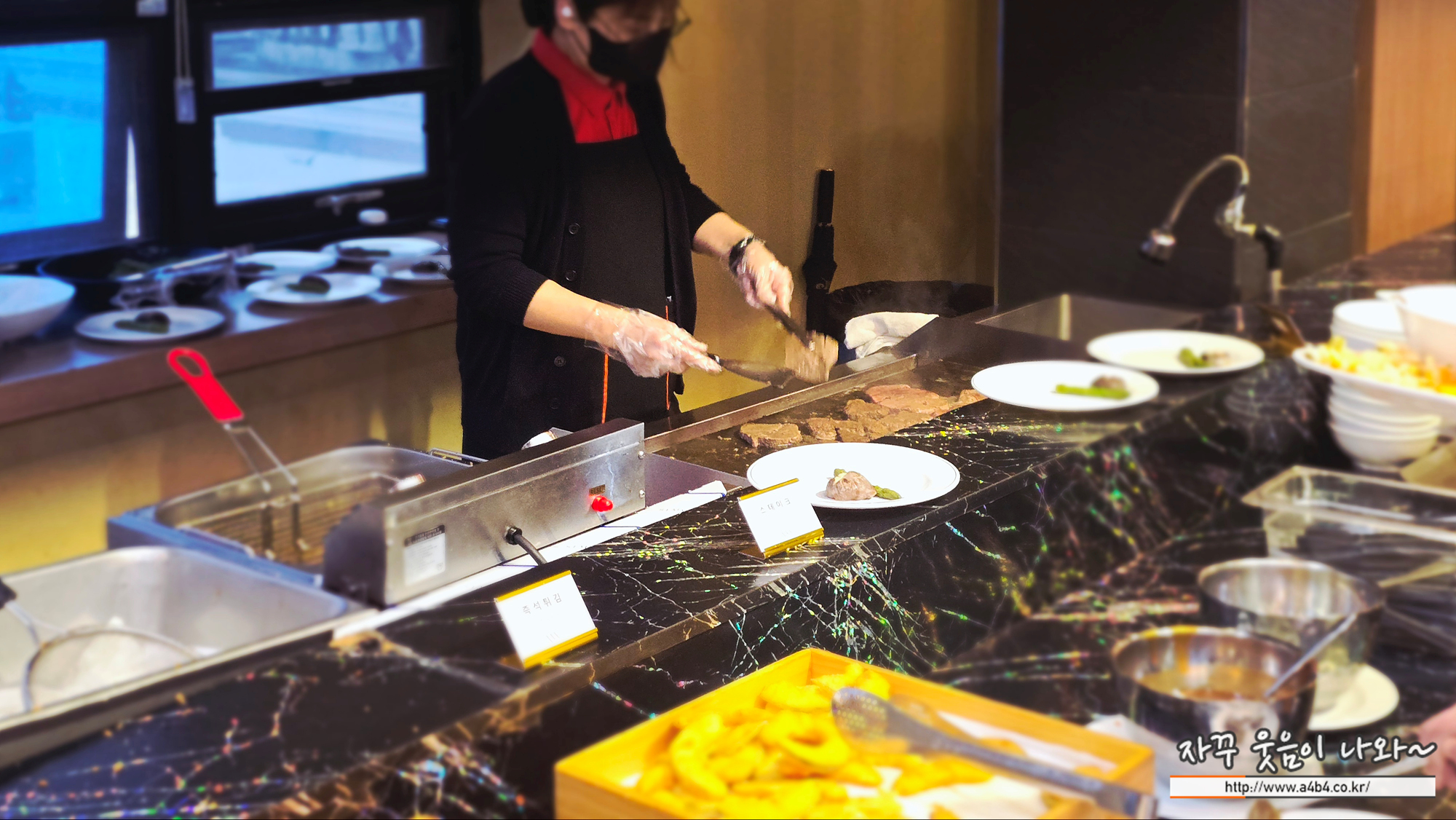 군산 한원컨벤션센터 뷔페 음식중에 가장 유명한 것이 이 스테이크라고 하고요. 가장 대기줄이 긴 곳이기도 합니다만, 맛은 그다지 좋다고 하기는 그렇네요. 그냥 냉동고기를 잘 구웠다기 보다는... 스테이크라고 하기도 그렇고...