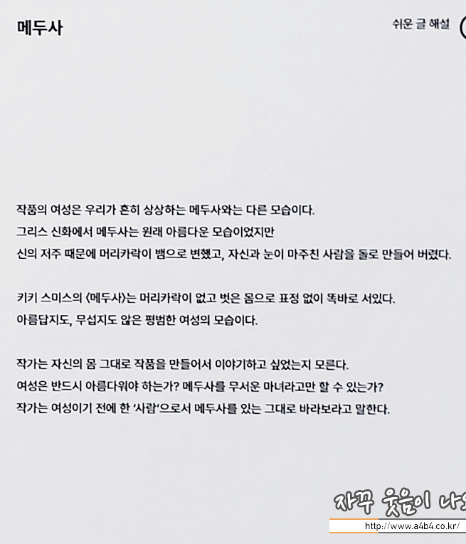 전시장 1층에는 '키키 스미스' 특별전이 열리고 있습니다. 그리고 백남준 작가의 서울 랩소디 작품을 감상할 수 있습니다. 오늘 소개하는 천경자 전시회는 물론 '키키스미스' 전시회도 추천 드립니다. 꼭 같이 보세요.