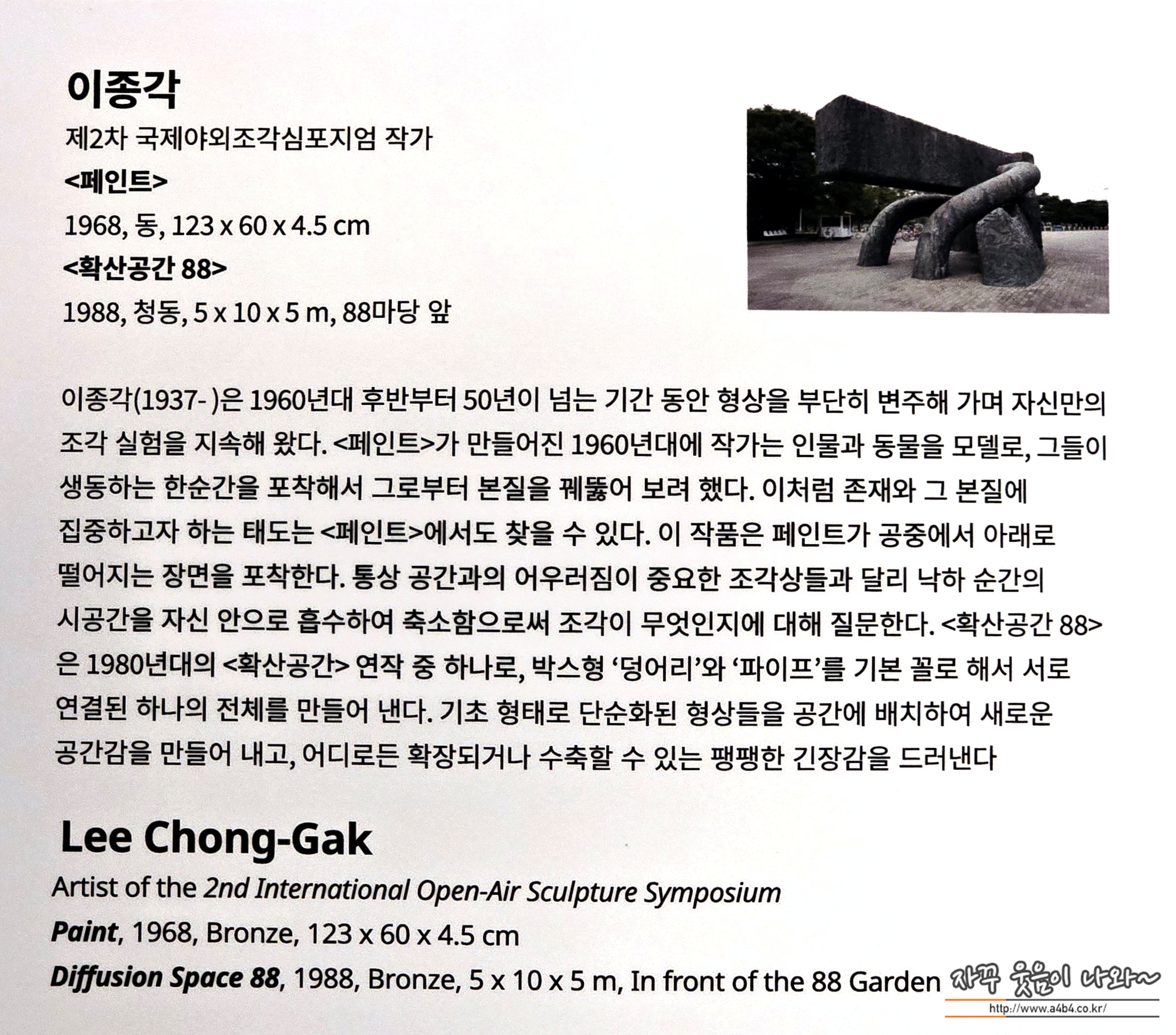 오늘은 소마미술관 1관에서 열리고 있는 '장소와 통로_고리타분한 조각이야기' 소개였습니다. 강동 송파구 거주하면서 종종 올림픽공원 산책하시는 분들은 너무나도 쉽게 무심결에 지나치게 되는 수많은 조각품들이 이런 이야기를 가지고 있다는 것을 다시 한 번 확인할 수 있는 좋은 기회네요. 시간내서 꼭 한 번 관람하시는 것을 추천 드립니다.