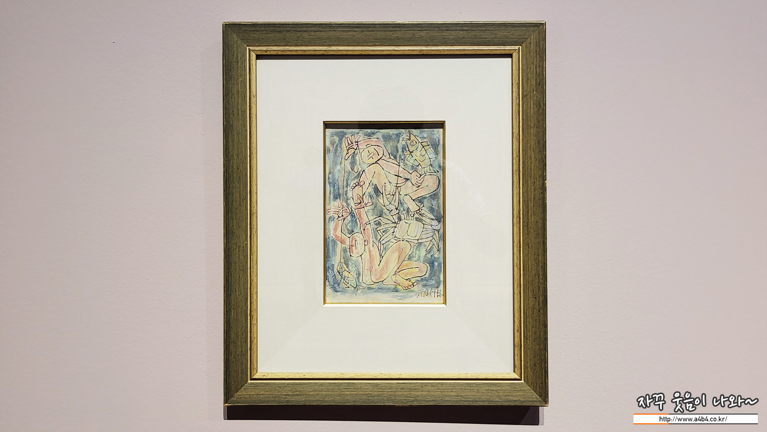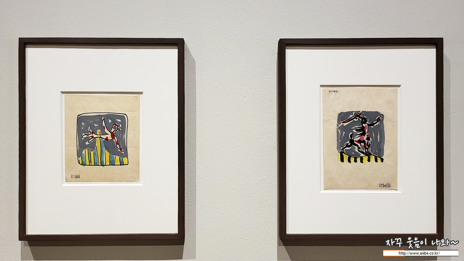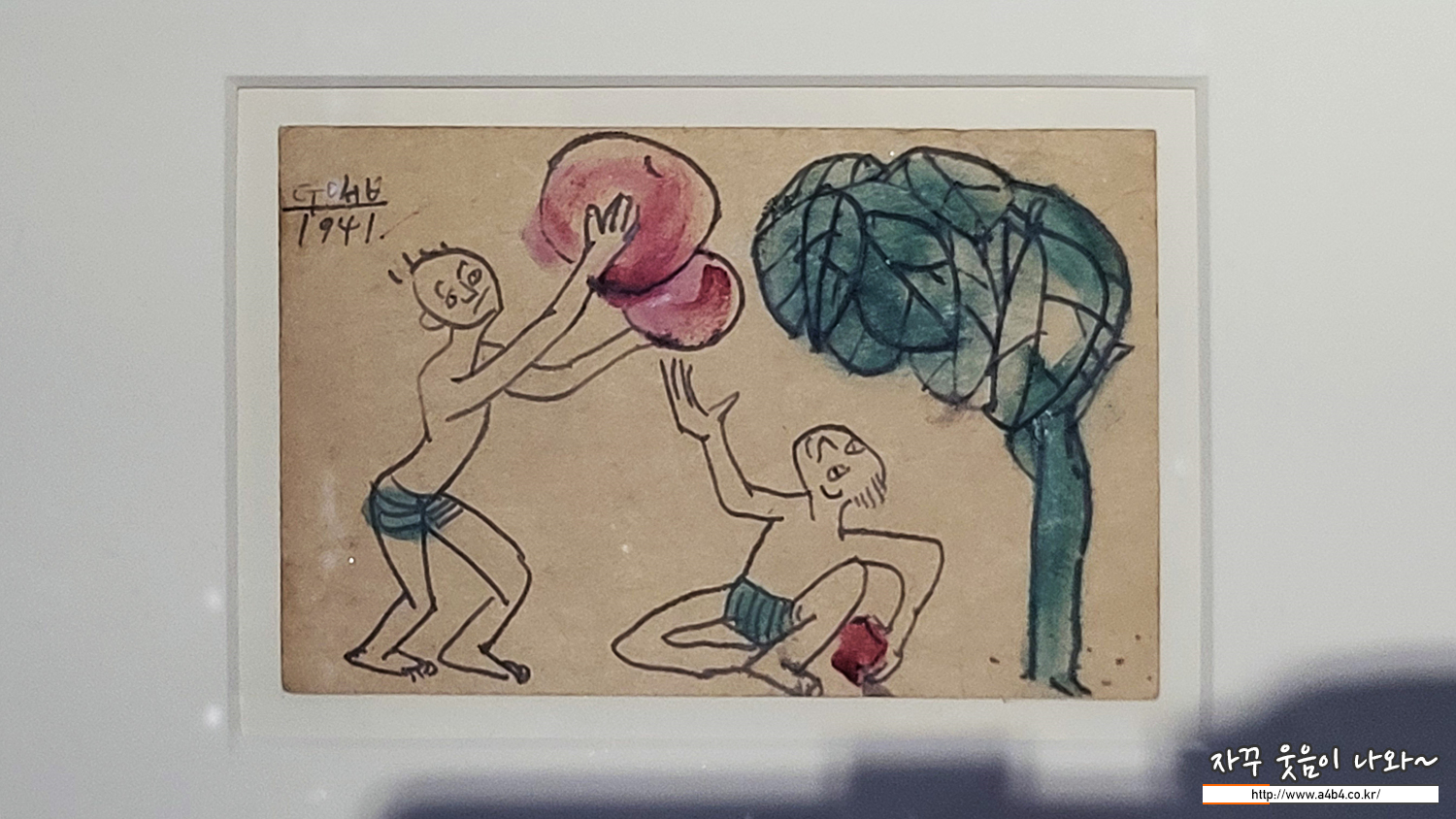 덕분에 마치 돌에 음각으로 새겨진 듯한 느낌을 받게 하죠. 원색이 조금 더 드러나는 오른쪽 작품은, 1954년 일본에 있던 큰아들 태현에게 보낸 편지에 그려져 있던 그림입니다.
