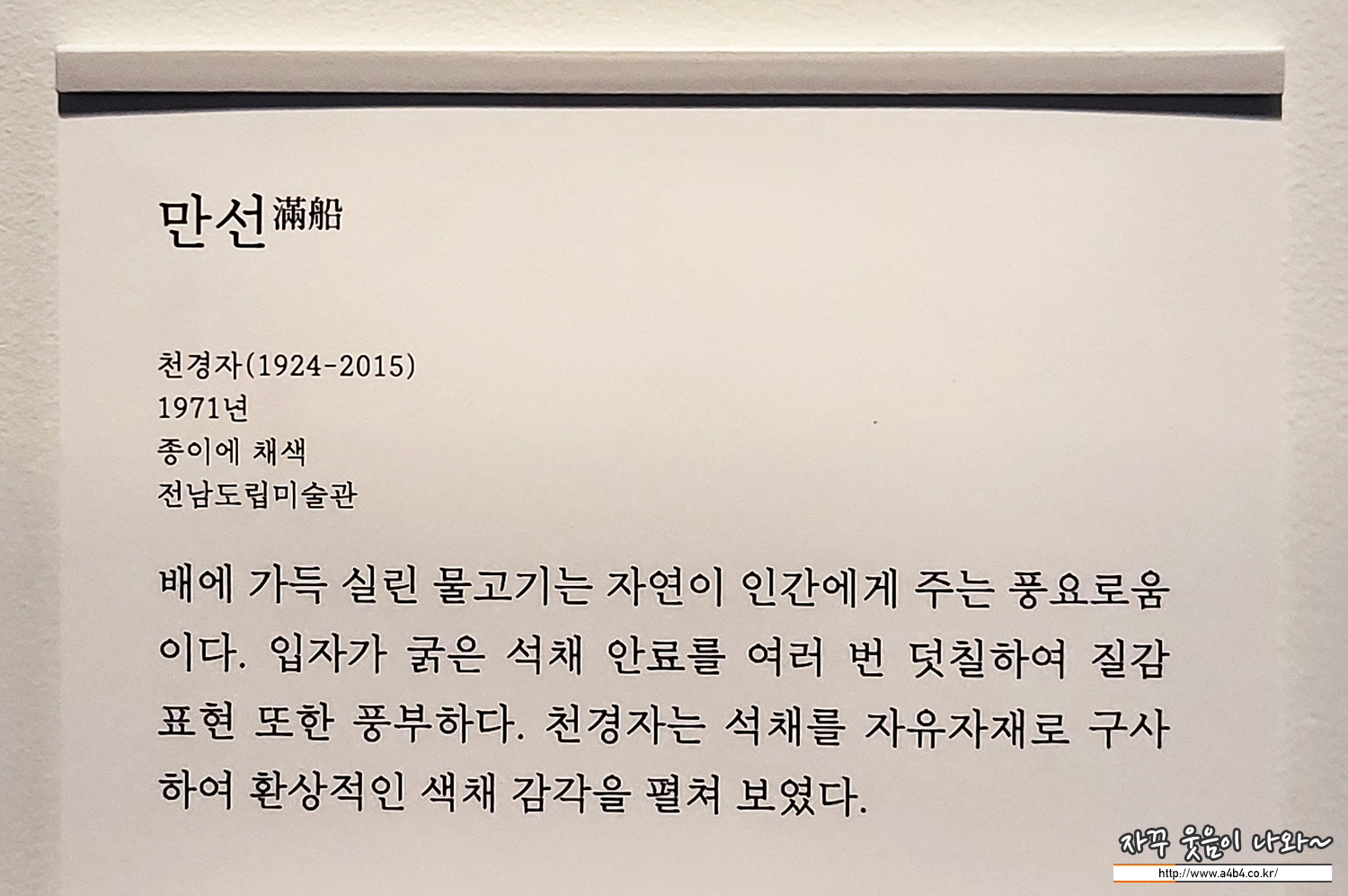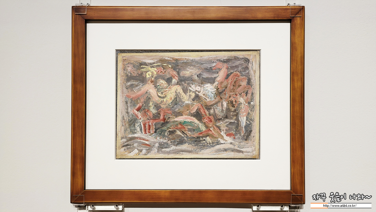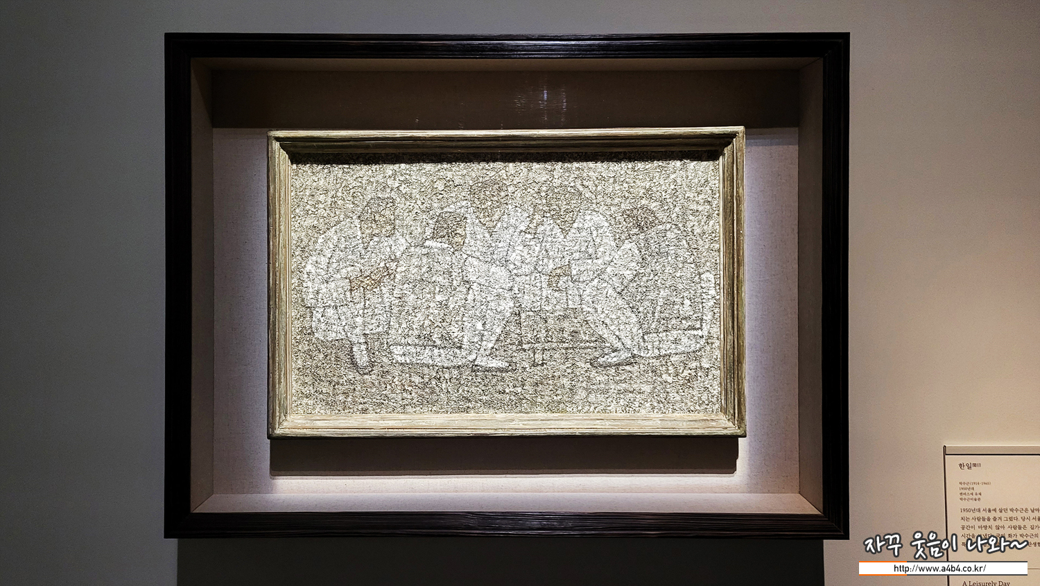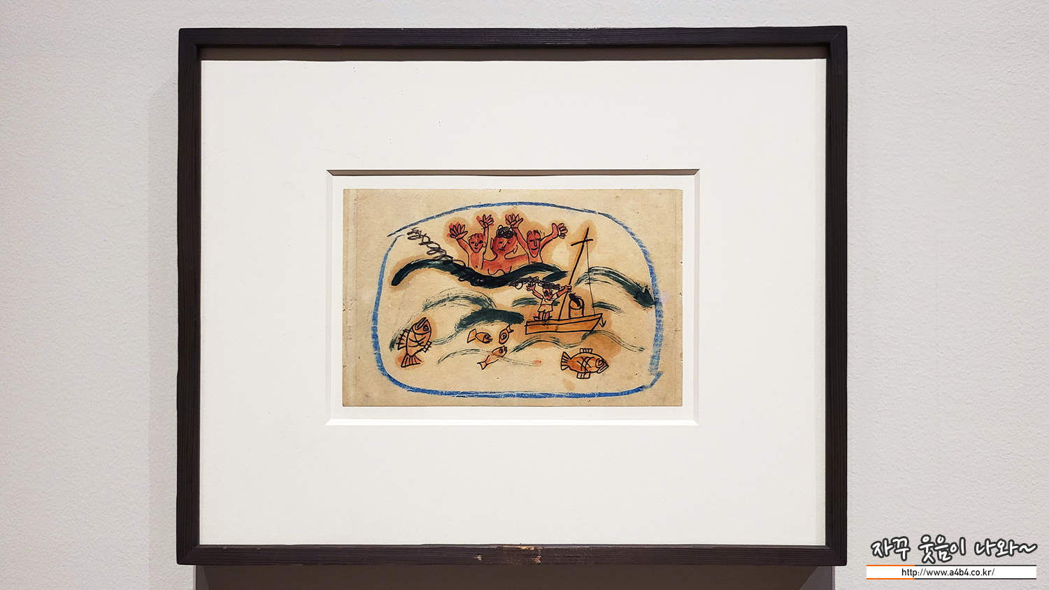덕분에 마치 돌에 음각으로 새겨진 듯한 느낌을 받게 하죠. 원색이 조금 더 드러나는 오른쪽 작품은, 1954년 일본에 있던 큰아들 태현에게 보낸 편지에 그려져 있던 그림입니다.