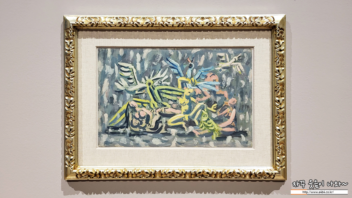 화면의 오른쪽 위에서는 붉은 닭이 날아올랐다가 방향을 선회하며 내려오고 있습니다. 왼쪽 아래의 푸른 닭은 바닥에 풀썩 주저앉은 채 궁지에 몰려있는 듯합니다. 하지만 부리를 쫙 열고 소리를 꽥 지르면서 필사적으로 응수하고 있죠. 유려한 선의 흐름과 거친 표면 효과가 서로 대비되면서 강한 운동감과 에너지를 뿜어내고 있는 그림인데요, 작가는 흥미롭게도 빨강, 노랑, 파랑 등으로 작품의 주된 형상을 그린 다음, 짙은 회색 물감을 화면 전체에 다시 엷게 펴 발랐습니다.