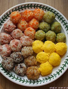 오늘은 집에 있는 재료 중심으로 오색 주먹밥 만들기를... 다인이도 함께 했어요... 주먹밥 레시피는 아래에서 설명하고... 우선 완성사진부터... 5색이 아니라 6색 주먹밥이 되었군요... 준비물은 간단합니다. 시계순으로 볶은 멸치, 완두콩, 당근, 햄, 버섯, 계란노른자... 등 남는 재료... 김도 좋고, 맛살도 좋고, 불고기도 좋고... 그리고 흰밥을 만들 쌀... 식초, 설탕, 소금... 우선 사용할 밥에는 약간 양념을... 식초에 설탕과 소금을 약간 넣고 끊인물과 참기름을 넣어서 초밥을 만듭니다. 1. 계란 주먹밥 삶은 계란 노른자를 고운채에 거르세요... 그리고 노른자 위에 밥을 굴리면 됩니다. 계란 노른자 주먹밥의 경우에는 손으로 쥐면 계란의 질감이 떨어집니다. 색상도 칙칙해 지고... 2..