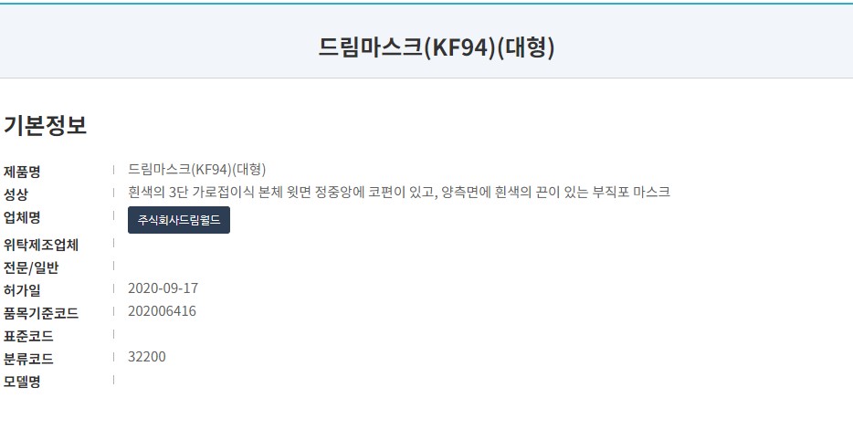 식약처 등록명칭은 '테라크린황사방역마스크 (KF94)'입니다. 마스크 색상은 화이트와 블랙 색상이 있으며, 제조사는 '주식회사테라크린'입니다. 작년 11월 승인된 마스크로 여러 타입의 마스크를 생산하고 있는 곳입니다.