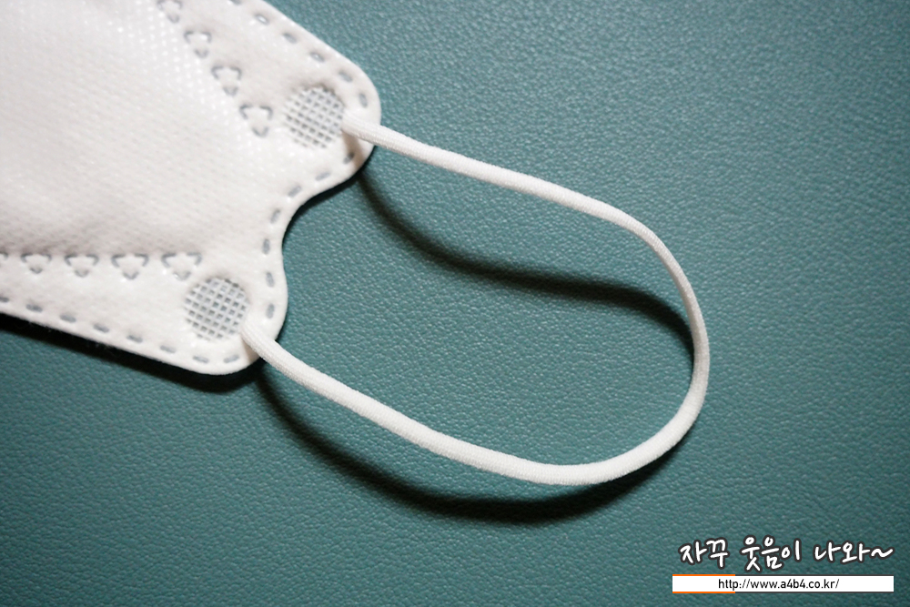 둥근모양의 끈이 사용된 아이애티 어어밴드는마스크 뒷면에 부착되어 있으며 이어밴드 탄성은 보통수준입니다. 우선 타사의 이어밴드에 비해 두께가 상당히 굵습니다. 탄성도 조금 약해서 잘 늘어나네요. 대두게에는 매우 매력적인 이어밴드.