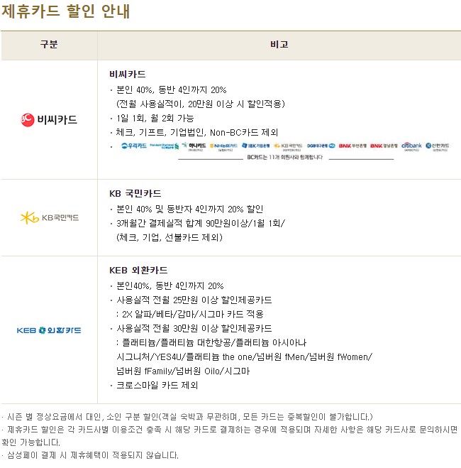 할인카드는 비씨카드, KB국민카드, 외환카드가 설악 워터피아 입장권 할인 됩니다. 다만 최대 할인폭은 40%이며, 전월 또는 최근 n개월 사용실적 등의 조건을 충족해야 합니다. 또한, 삼성페이로는 할인되지 않고, 실물 카드나 해당 카드사 앱카드가 필요합니다.