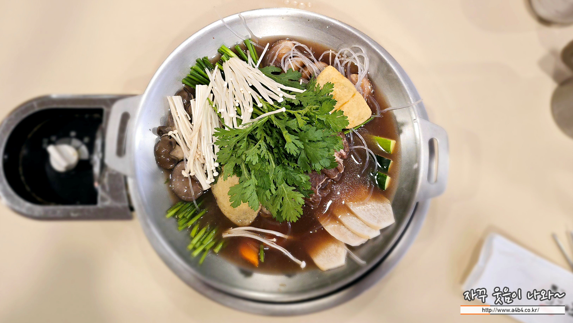 테이블 불판위에 불고기 전골이 올라오고요. 바로 조리가 시작됩니다.
