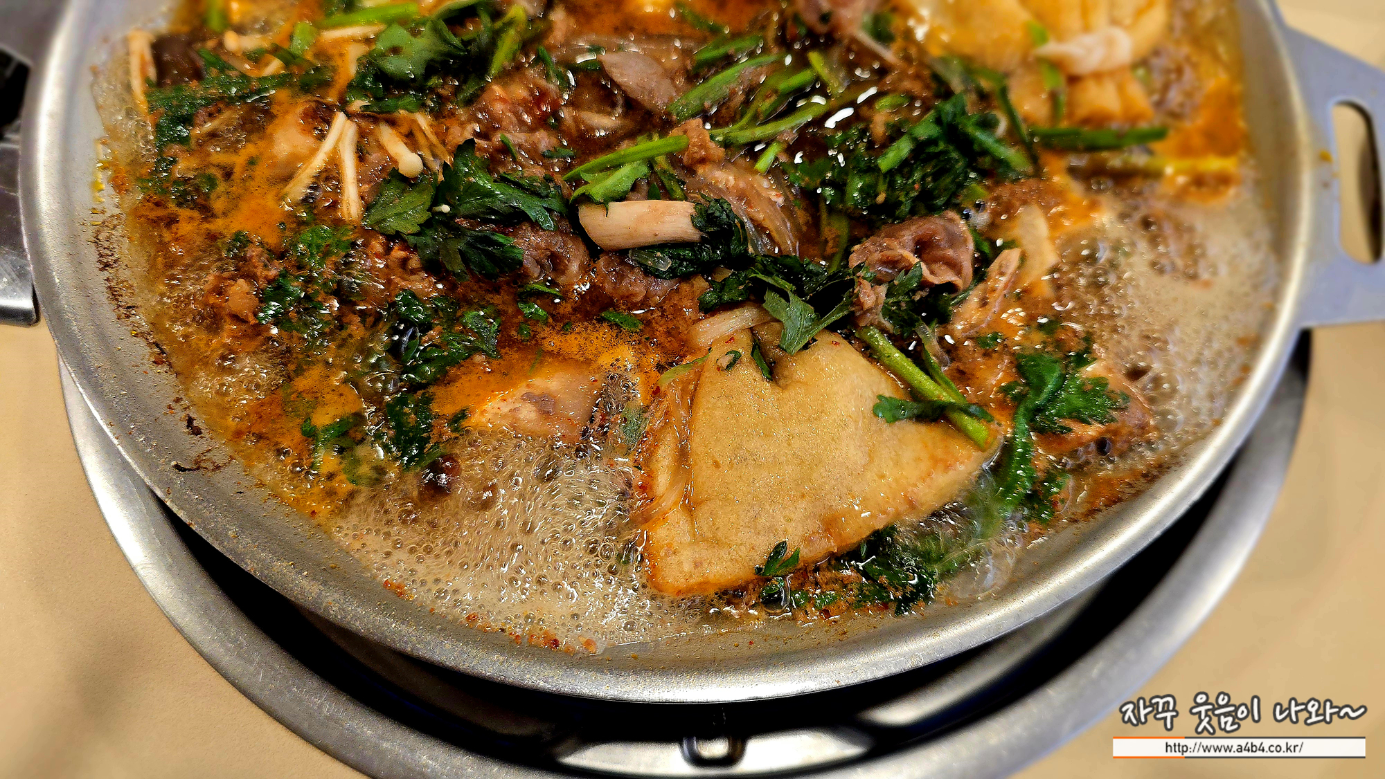 가스불이 엄청나게 강하니 반찬그릇 거리두고 조심하라는 말씀 하시네요. 역시나 바로 전골이 끓기 시작합니다.