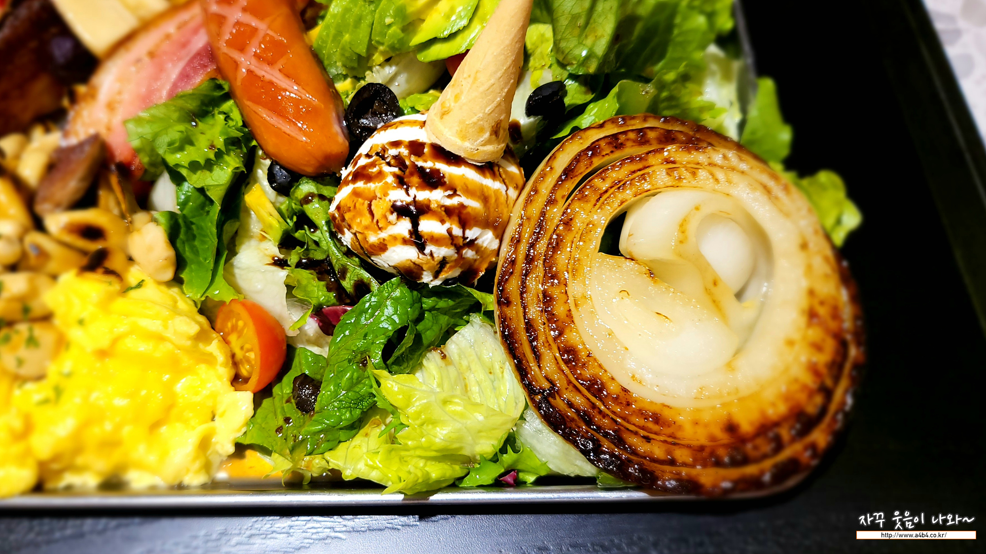 가성비도 좋고 양도 푸짐하고 상당히 맛있게 잘 먹은 메뉴 중 하나가 바로 계산동 브런치가든 시그니처 플래터 입니다. 구운 양파, 아보카도, 리코다, 스프램블, 블랙올리브, 방울토마토, 미니 새송이 등 다양한 야채와 견과류가 포함되어 있고요.