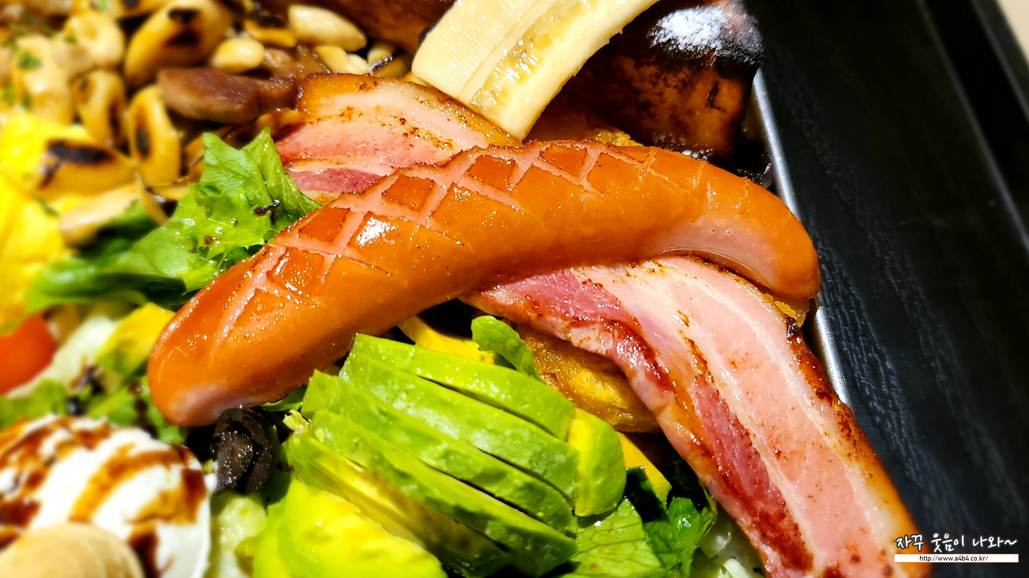 아보카도와 베이컨, 목살, 소시지, 구운 닭다리살 등의 육류...