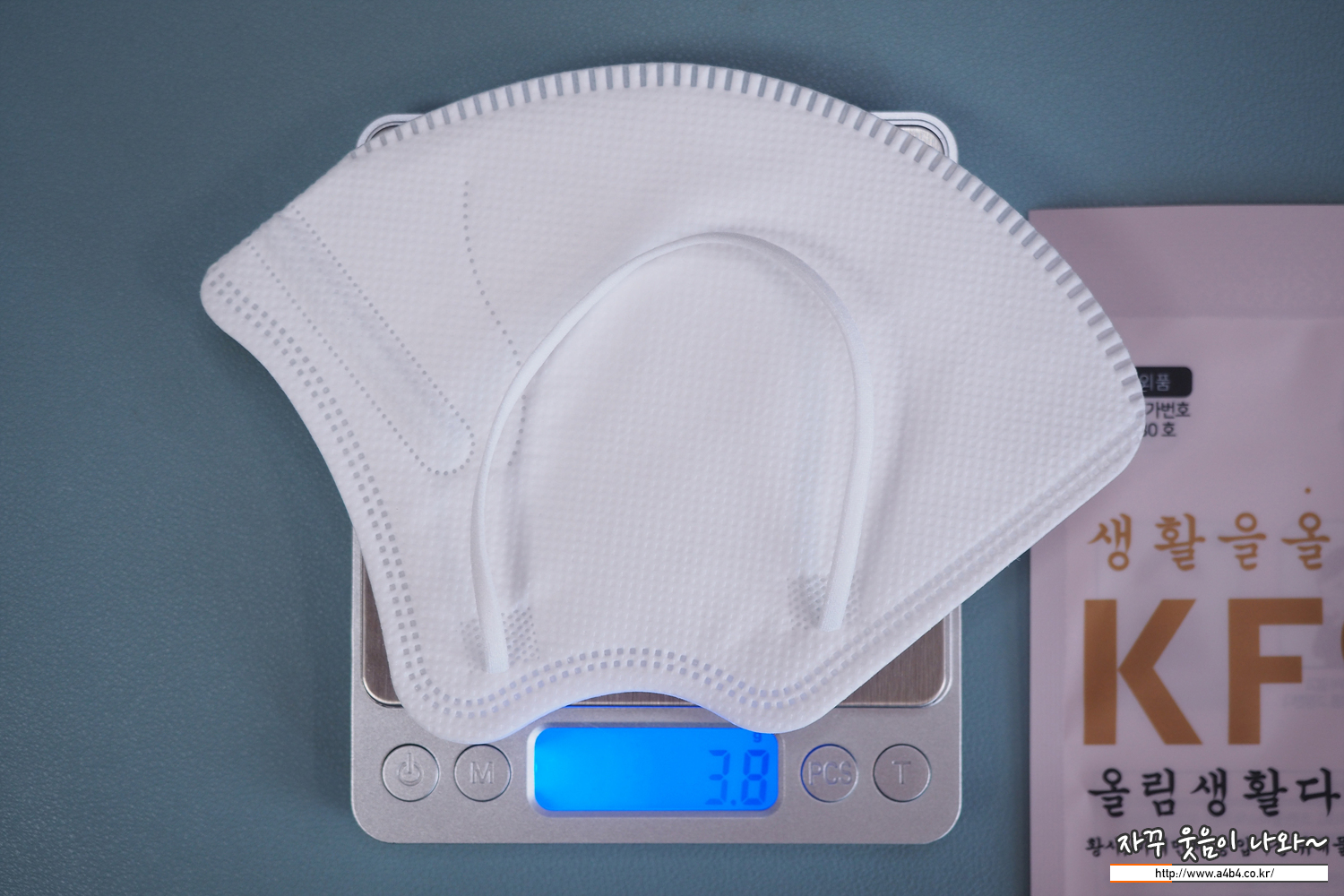 KF94 새부리형 케어마스크 대형 무게는 3.8그램으로 타사 제품에 비해 약간 가벼운 무게를 보여줍니다.