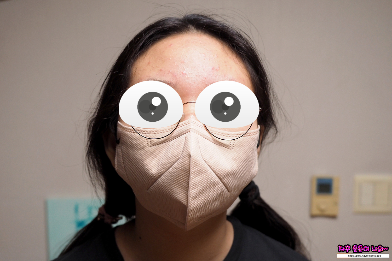 다만, 착용핏은 아래 사진들과 같이 접합부위가 상대적으로 안정적이지 못하네요 (운다고 할까요?) 또한 저의 얼굴형 기준으로는 마스크 양쪽 끝 이어밴드 부분이 들뜨는 착용핏을 보입니다. 정명에서 보면 물고기 아가미가 연상되는...