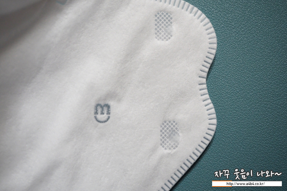마스크 외피는 도트 처리된 매끈한 촉감의 부직포가 적용되었으며 매우 얇은 타입의 제품입니다. 얇지만 모양을 잘 잡아주는 제품이지만 너무 얇다 보니 숨을 쉬면 마스크가 고정되지 못하는 불편한 부분도 있습니다.