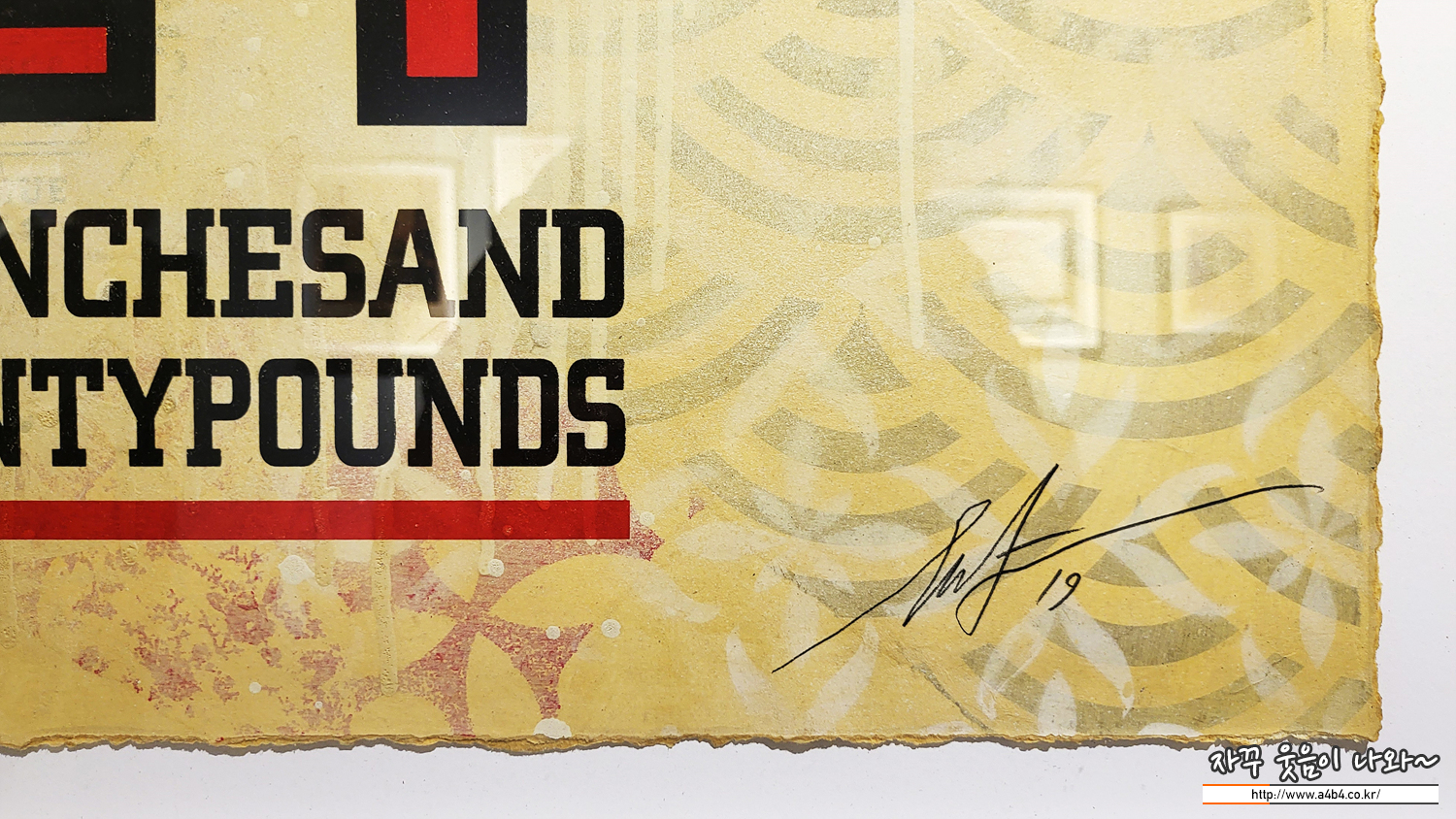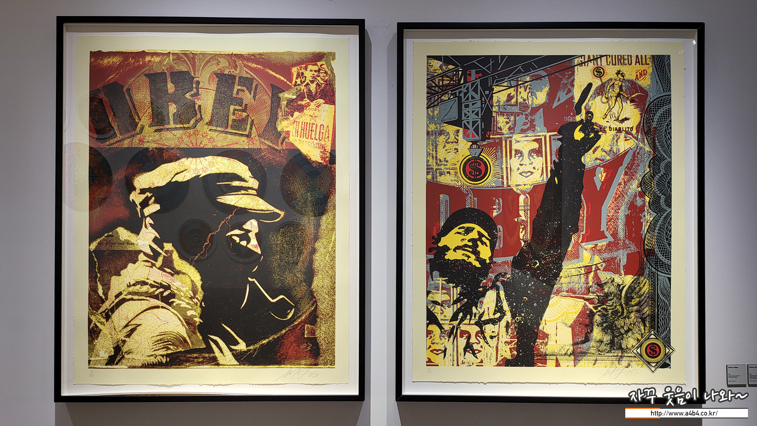 배경에 겹겹이 쌓인 여러 가지 패턴과 내용을 식별하기 어려운 텍스트는 이 <오베이 스타>를 구성하는 굳건한 신념과 역사, 그리고 셰퍼드 페어리가 걸어 온 길을 짐작하게 합니다.