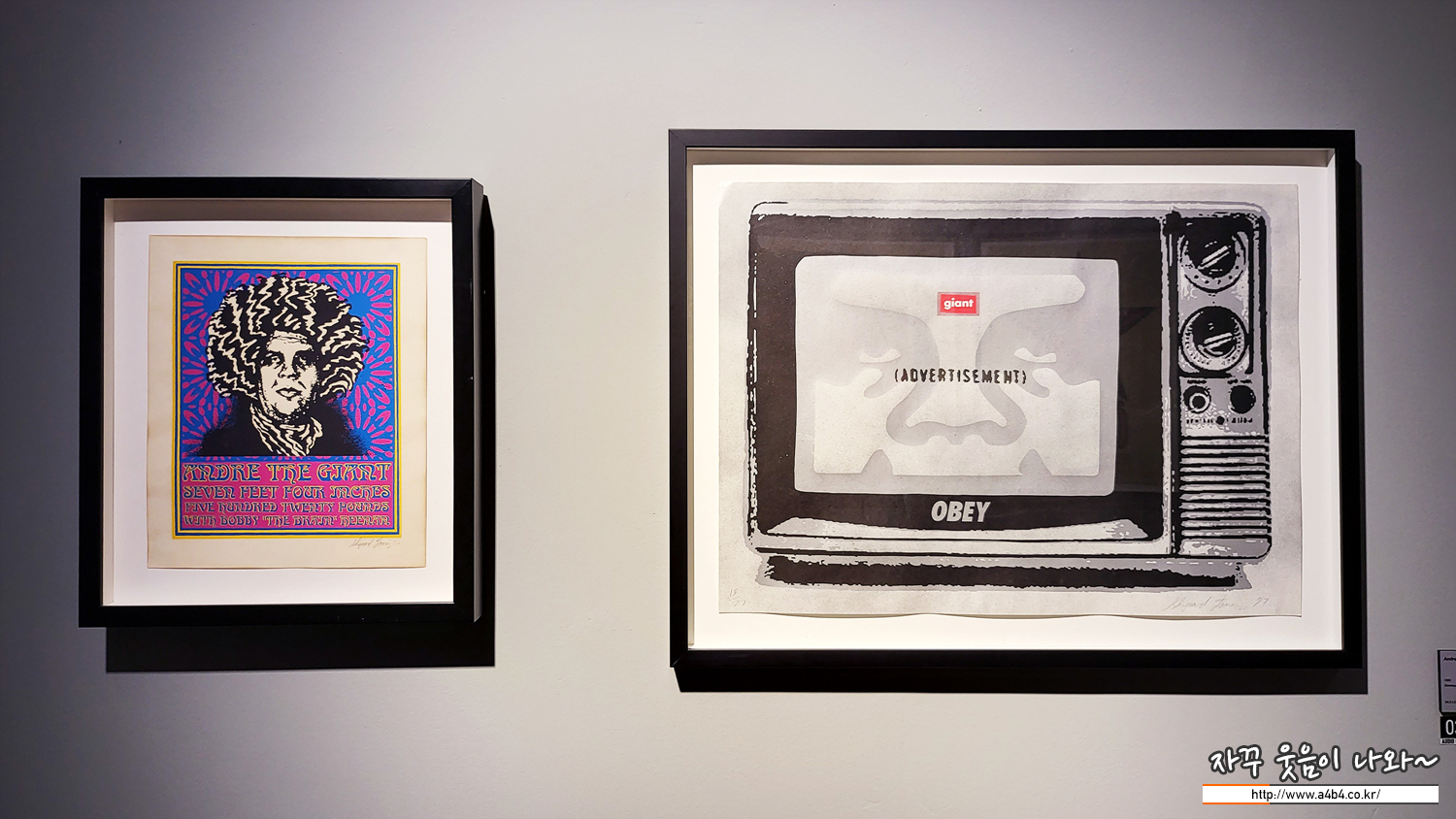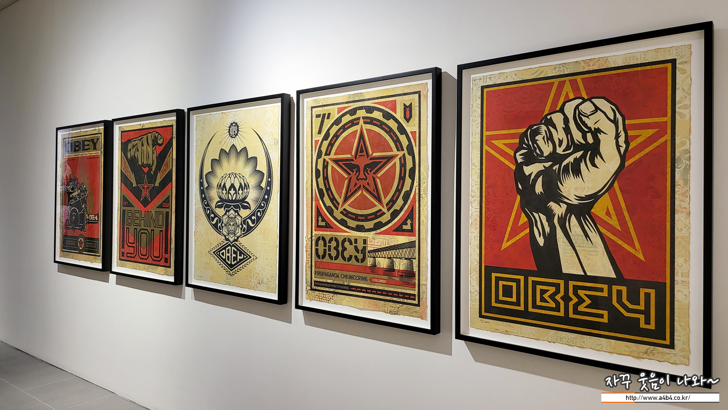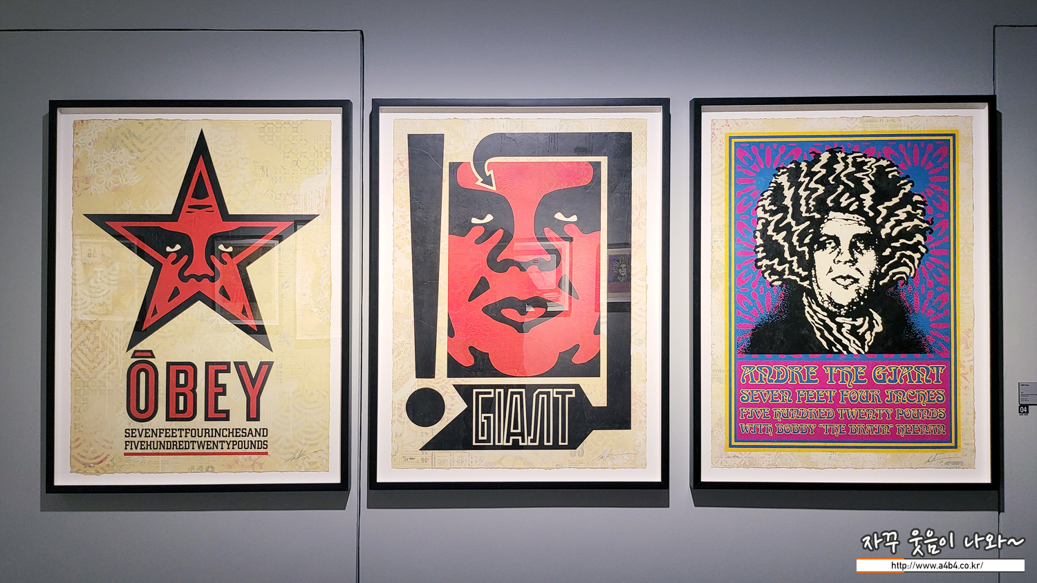 전시회의 첫 공간은 그의 대표 아이콘인 '앙드레 더 자이언트'와 OBEY 작품으로 구성되어 있습니다.