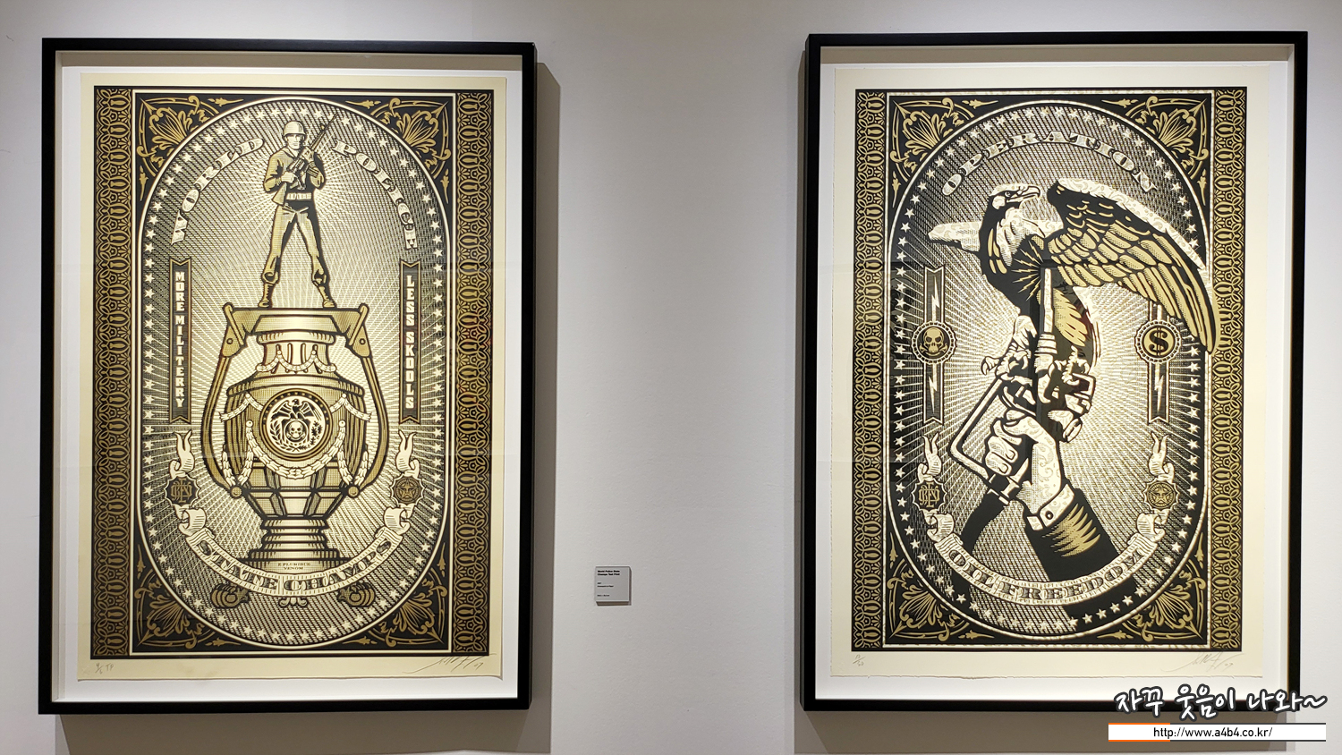 셰퍼드 페어리는 보다 상징적인 도상을 활용해 기존의 이미지를 재구성하고, 텍스트를 병치하는 작업을 반복하며 메시지를 강화했습니다.