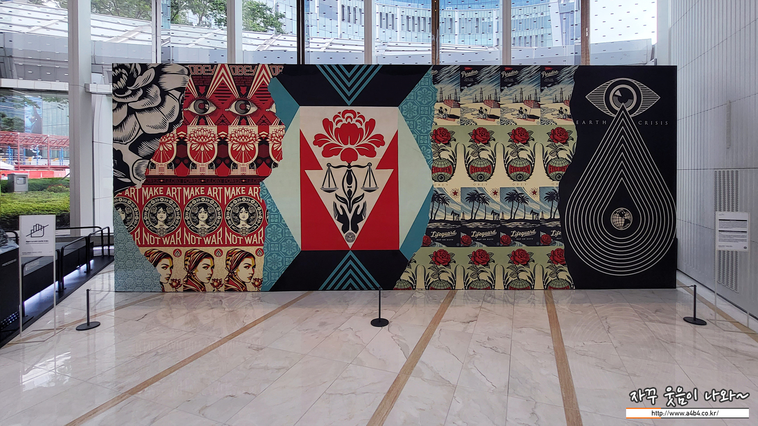 ‘메이크 아트 낫 워' 슬로건을 통해 셰퍼드 페어리는 파괴가 아닌 예술을 통한 창조를 강조하며 세계 평화의 메시지를 외칩니다.