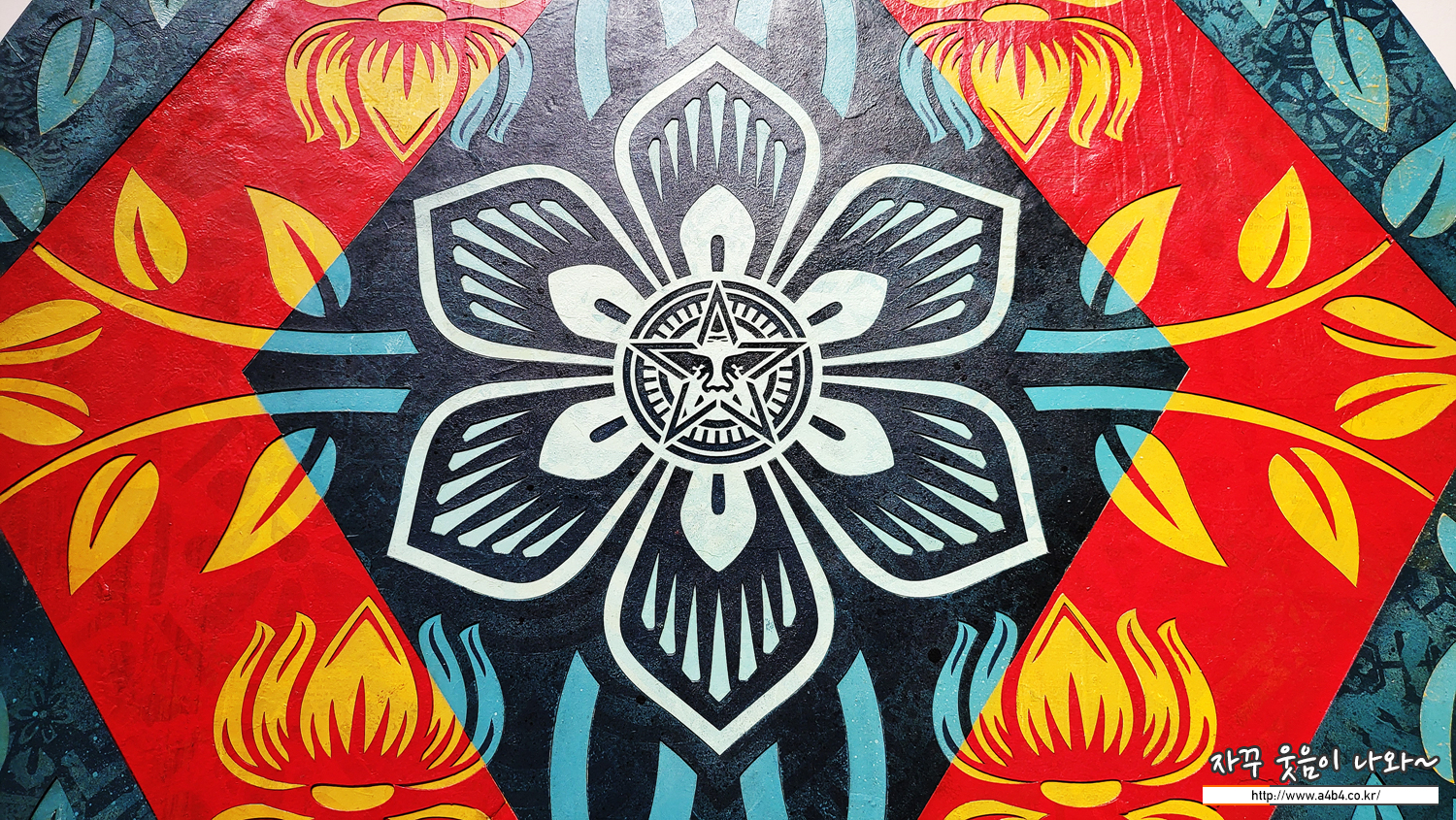 배경에 겹겹이 쌓인 여러 가지 패턴과 내용을 식별하기 어려운 텍스트는 이 <오베이 스타>를 구성하는 굳건한 신념과 역사, 그리고 셰퍼드 페어리가 걸어 온 길을 짐작하게 합니다.